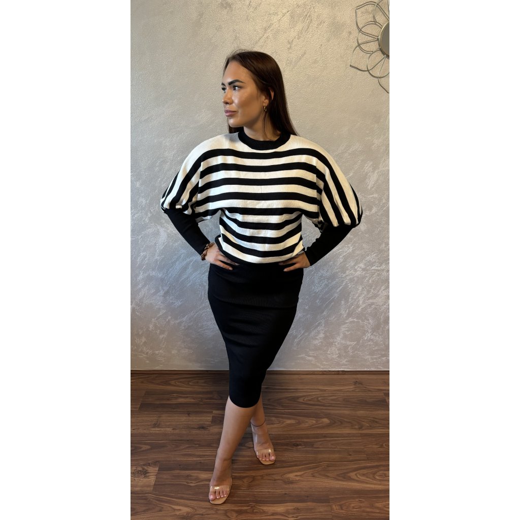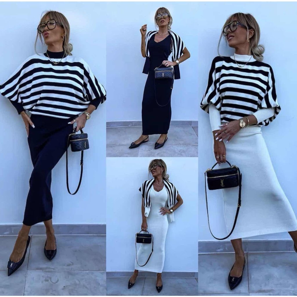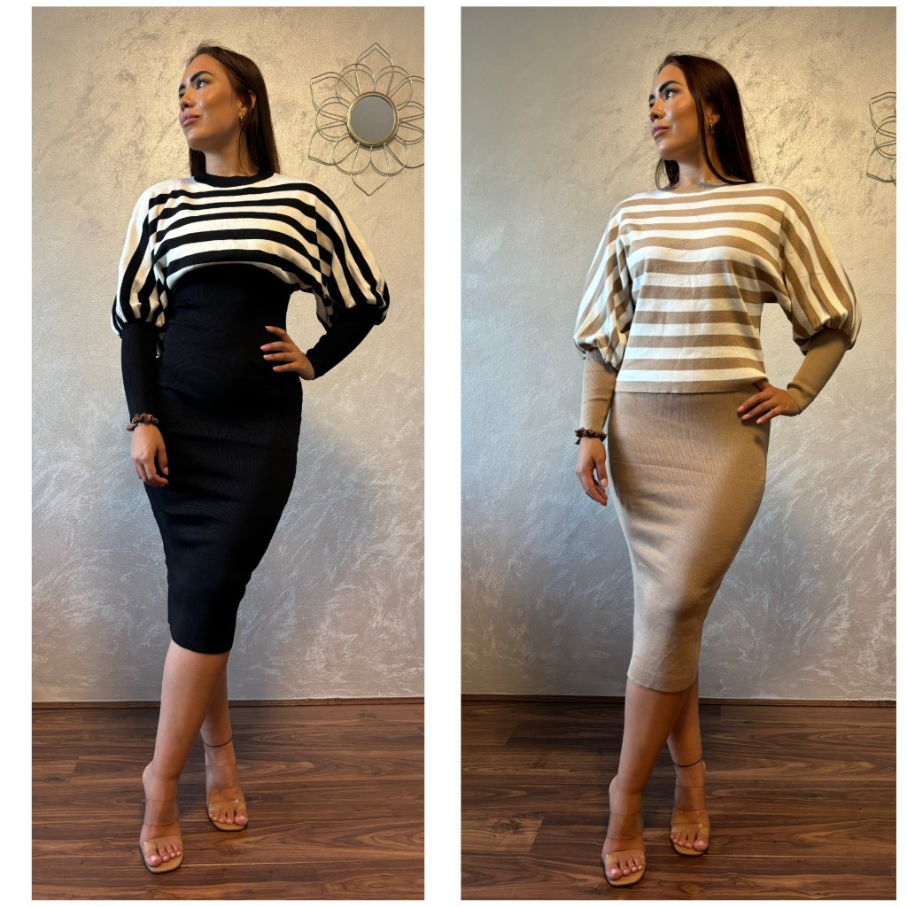Tento elegantní komplet se skládá z pruhovaného svetru a přiléhavých šatů, které vytváří harmonický a vzhled. Svetr má volný střih s nafouknutými rukávy a stylovým pruhovaným vzorem, který přidává moderní nádech. Šaty jsou úzké a dokonale zvýrazňují ženskou siluetu. Tento komplet je dostupný ve dvou variantách: černobílá klasika a béžová elegance. Ideální volba pro formální i neformální příležitosti.