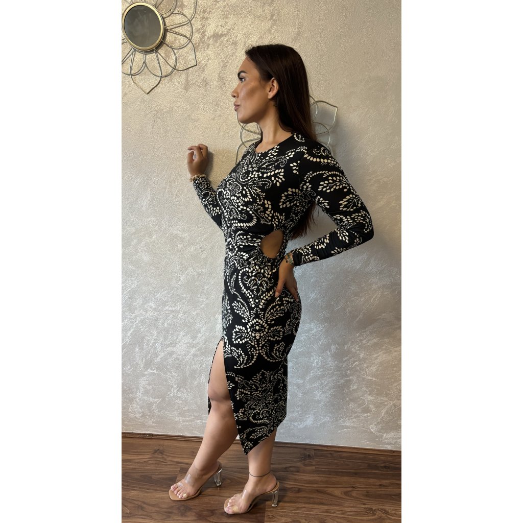 Elegantní a stylové černé midi šaty s kontrastním krémovým vzorem, které zaujmou na první pohled. Tyto šaty mají moderní design s odvážný výřez na levým boku a vysoký rozparek, který přidává na atraktivnosti. Přiléhavý střih dokonale zvýrazňuje ženskou siluetu, zatímco dlouhé rukávy poskytují eleganci a pohodlí. Jsou ideální volbou pro večerní události nebo formální příležitosti, kdy chcete vypadat stylově a zároveň působit sebevědomě.