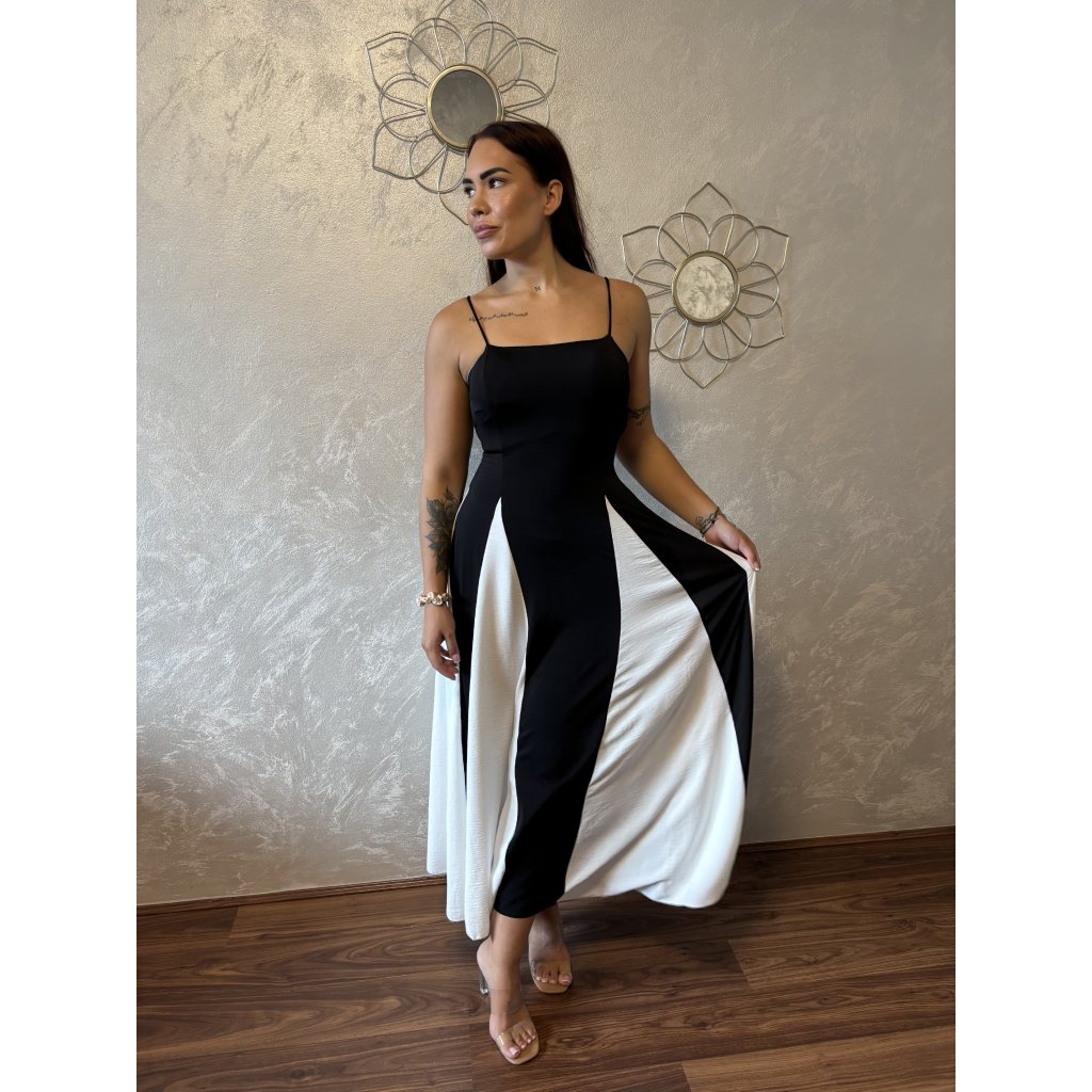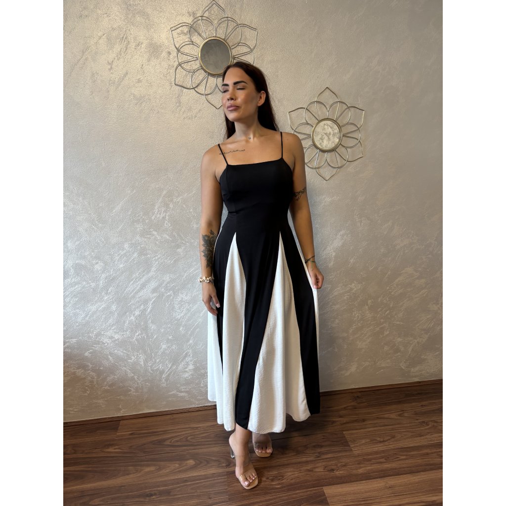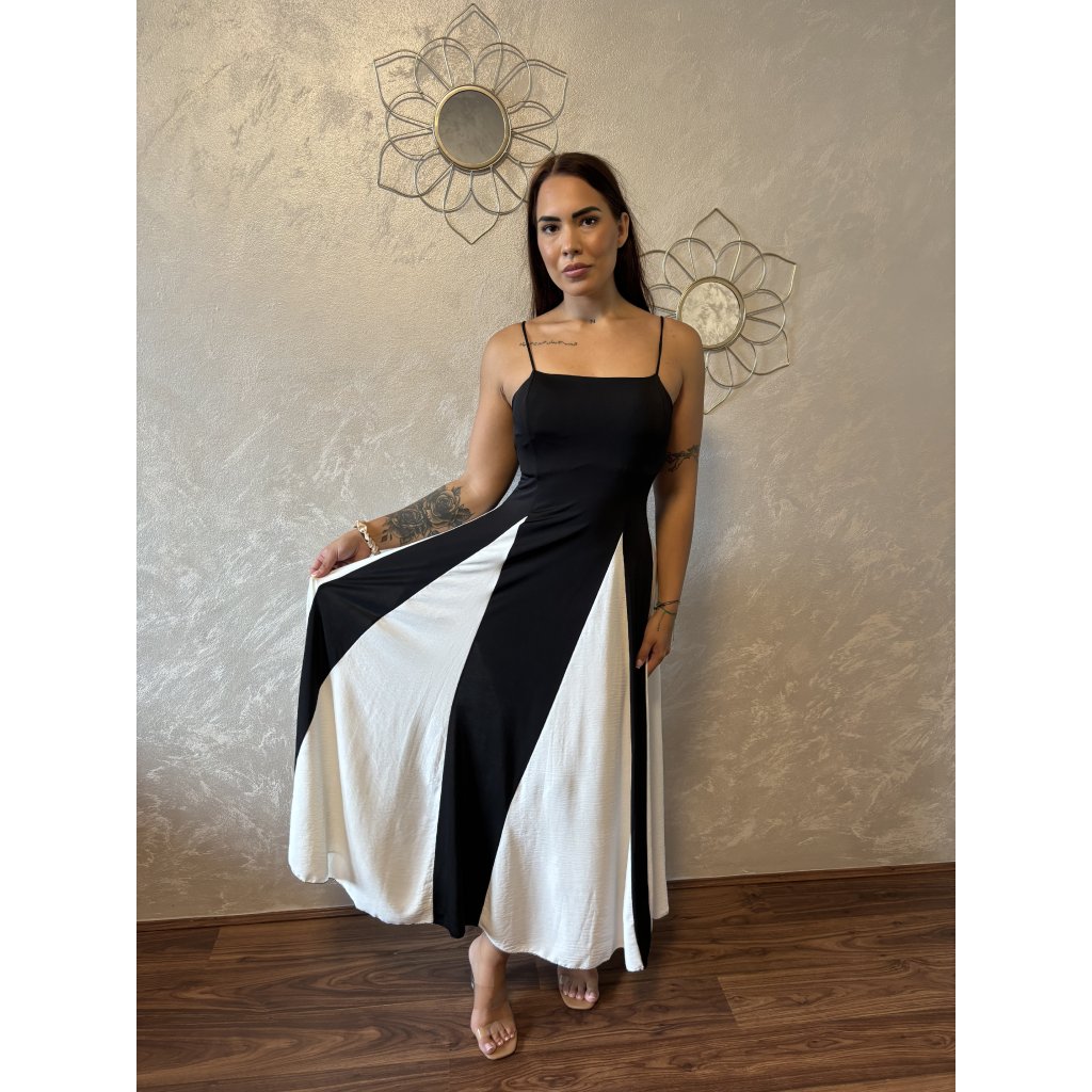 Tyto stylové černobílé šaty jsou ideální volbou pro moderní ženu, která hledá elegantní a současně pohodlný kousek. Šaty mají tenká ramínka a jednoduchý čtvercový výstřih, který podtrhuje nadčasovou ženskost. Přední část je zajímavě řešena kontrastem černé a bílé barvy, což vytváří výrazný vizuální efekt a zeštíhluje postavu. Tento kousek snadno zkombinujete s podpatky či sandály pro elegantní vzhled, který upoutá pozornost.