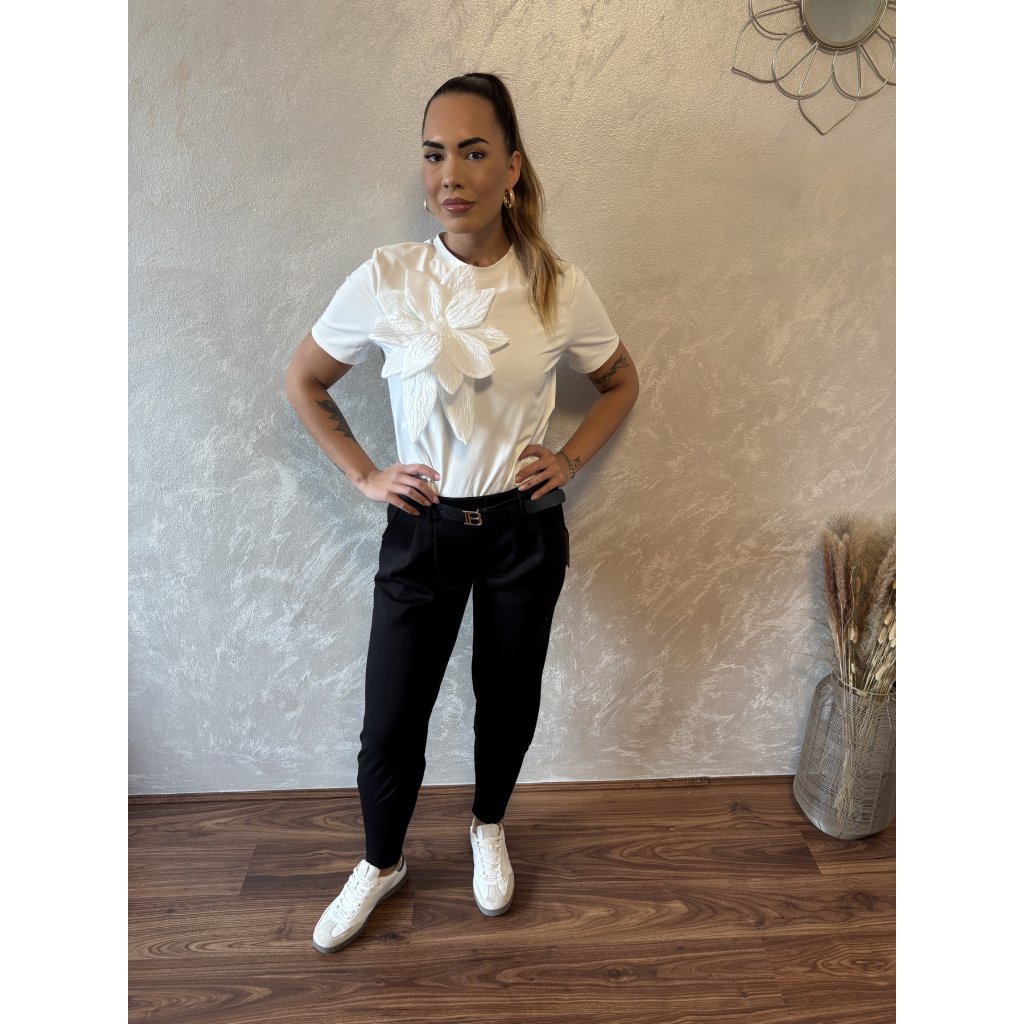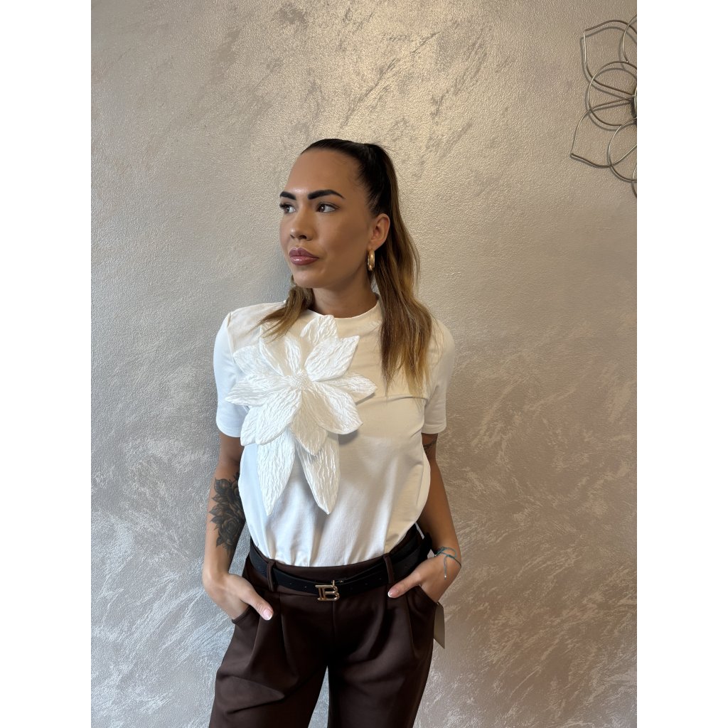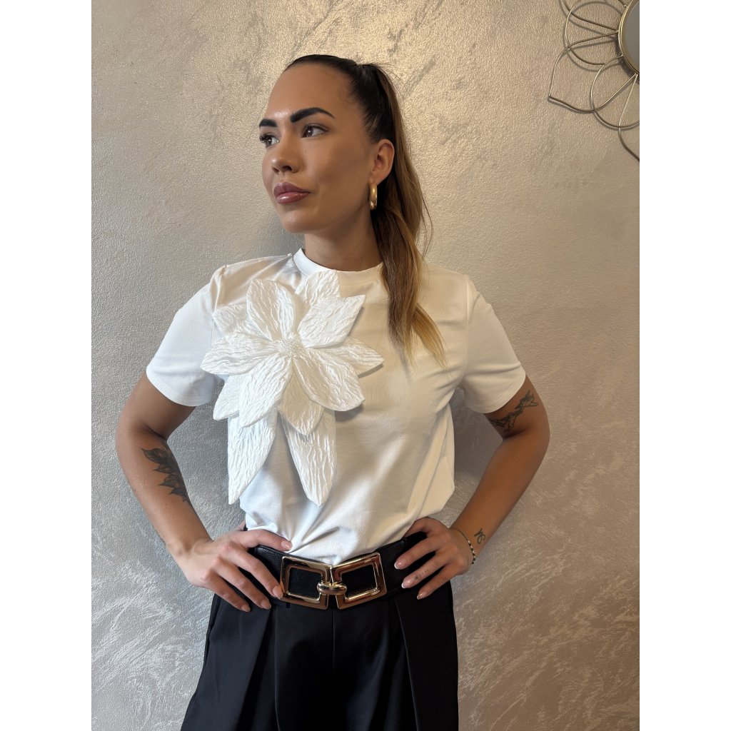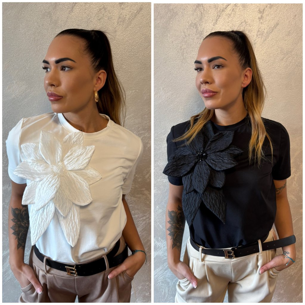 Elegantní a stylové tričko s výrazným 3D květem, které dodá vašemu outfitu jedinečný šmrnc. Perfektně se hodí k elegantním kalhotám i sportovnějším kombinacím. Dostupné ve dvou nadčasových barvách – bílé a černé.