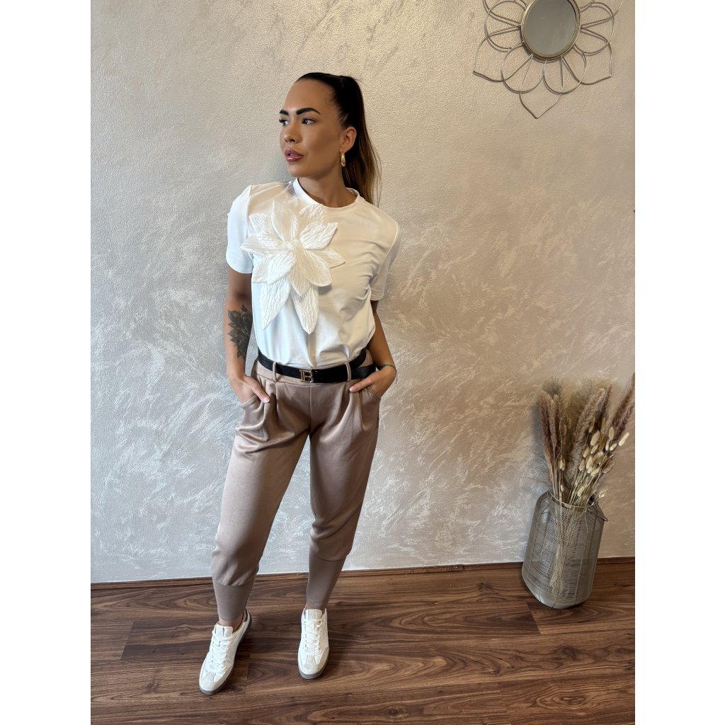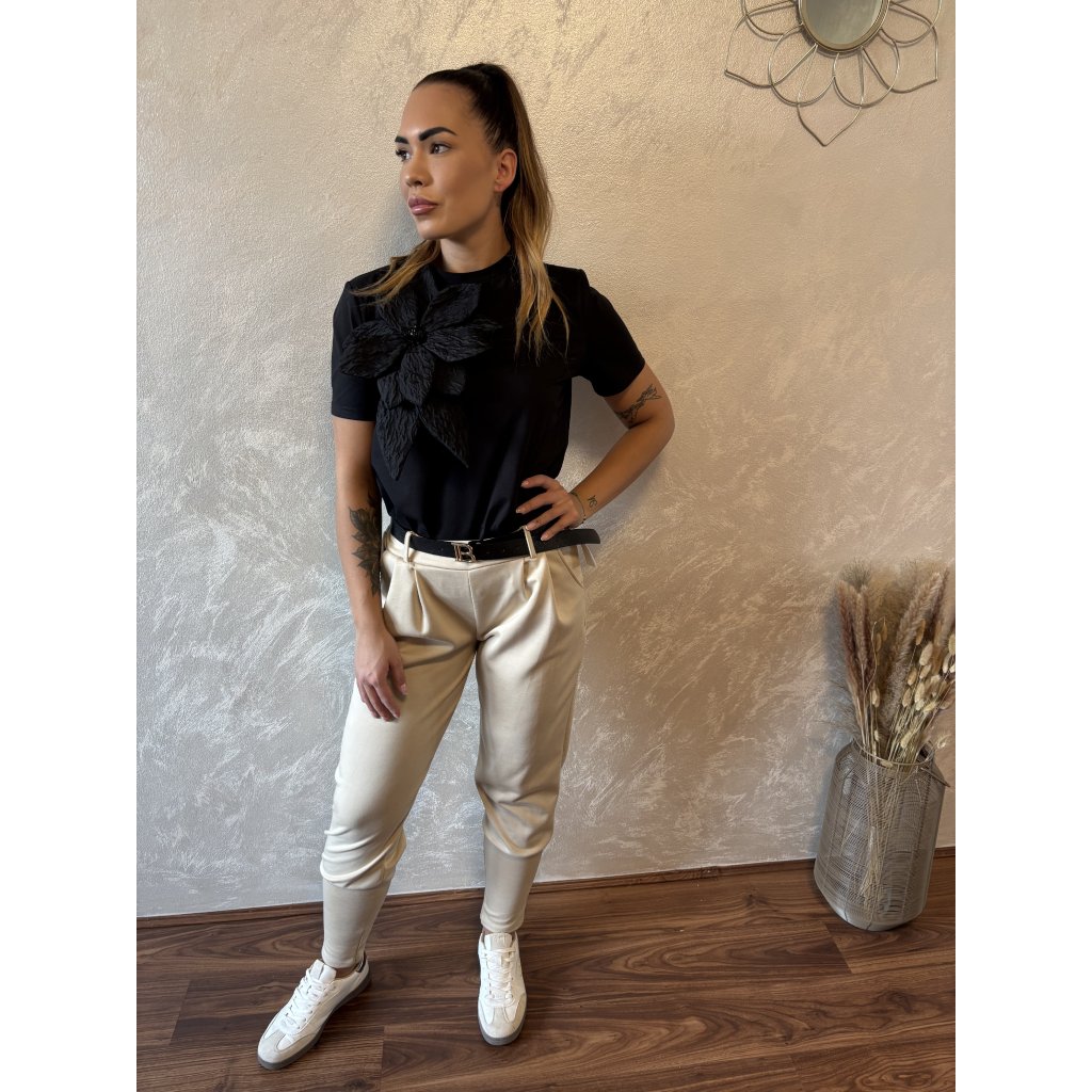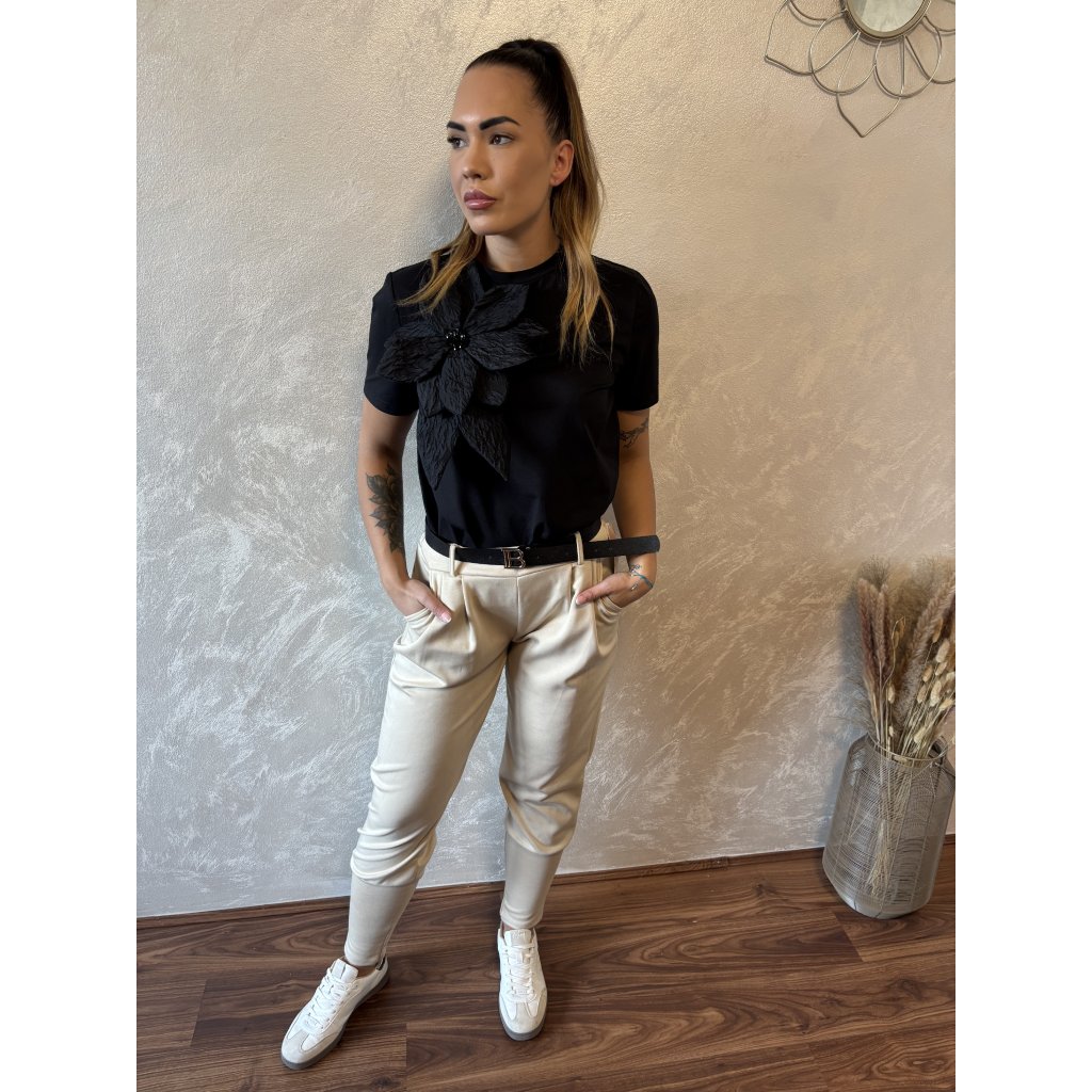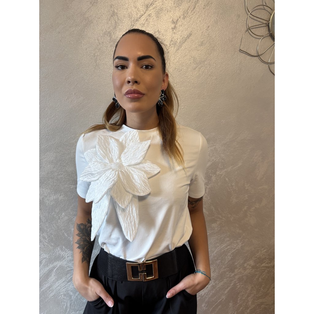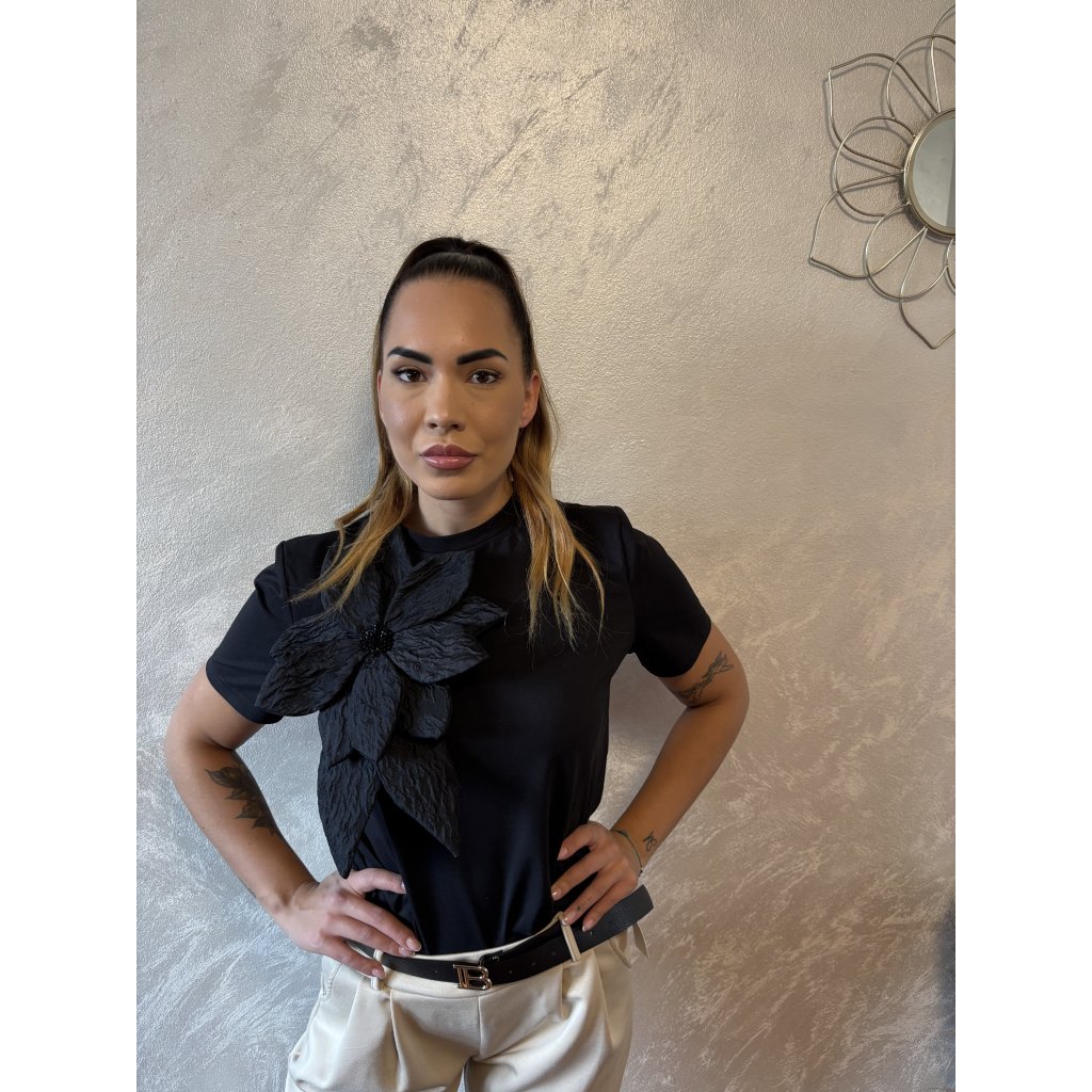 Elegantní a stylové tričko s výrazným 3D květem, které dodá vašemu outfitu jedinečný šmrnc. Perfektně se hodí k elegantním kalhotám i sportovnějším kombinacím. Dostupné ve dvou nadčasových barvách – bílé a černé.