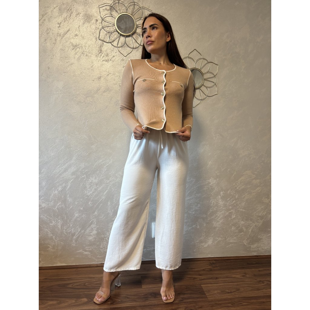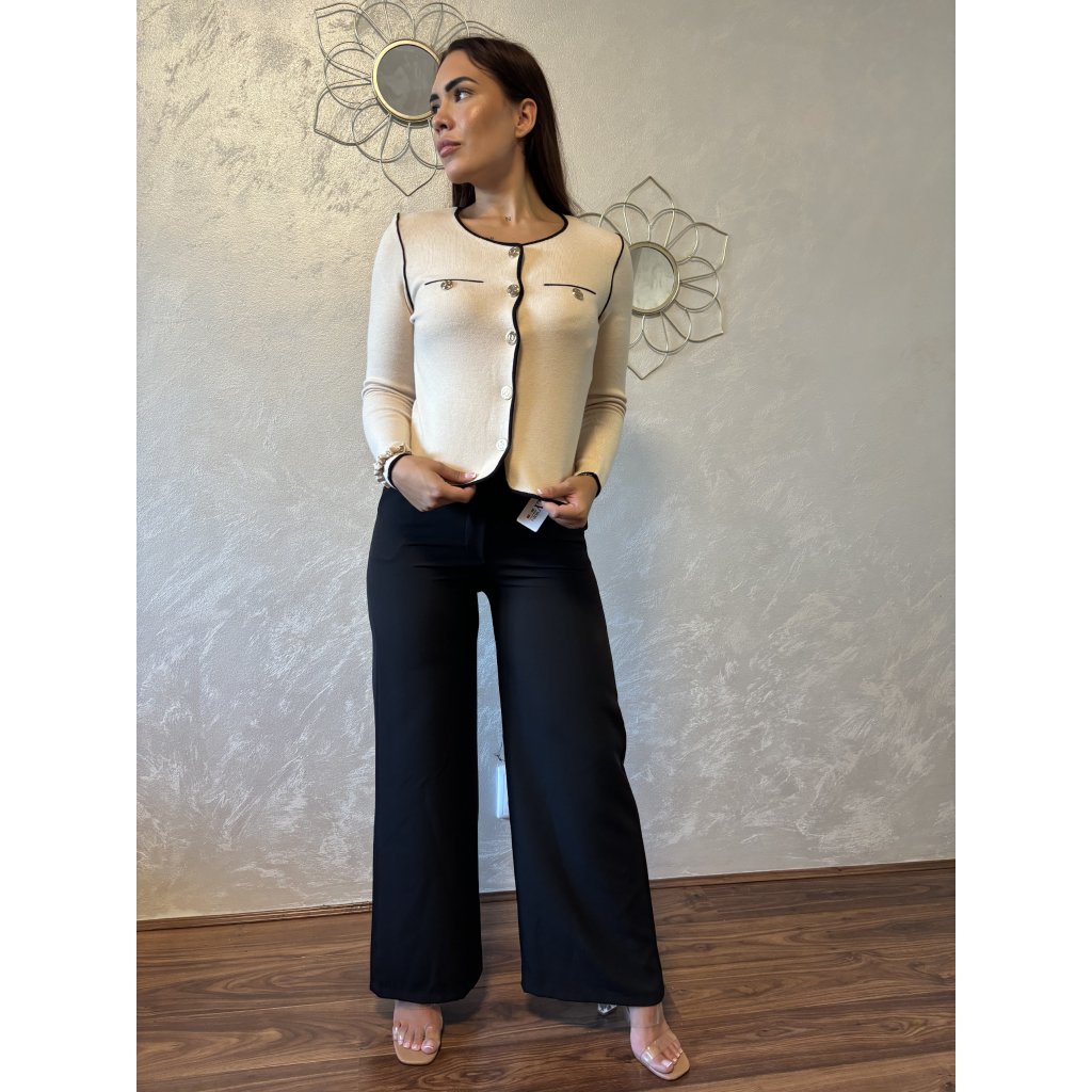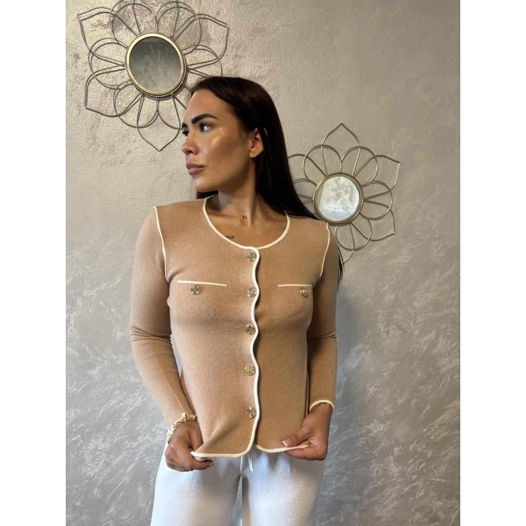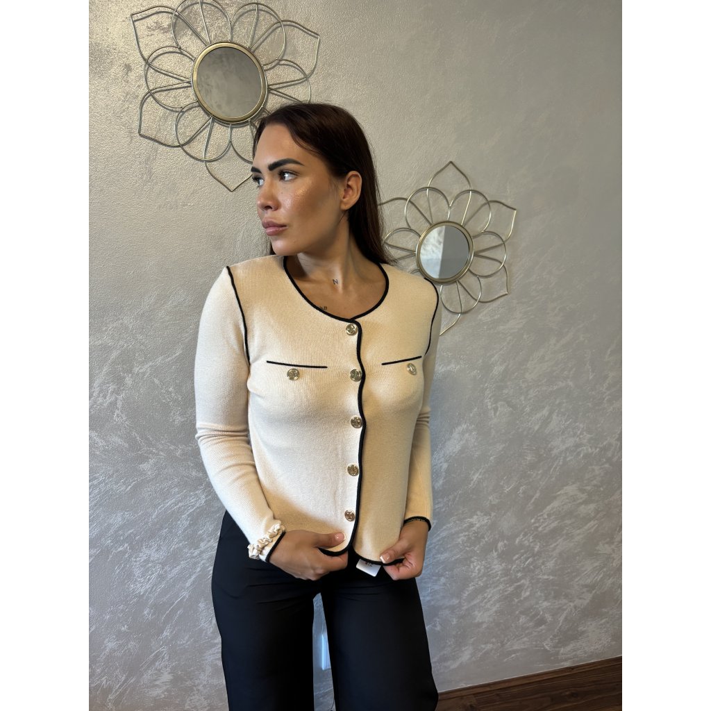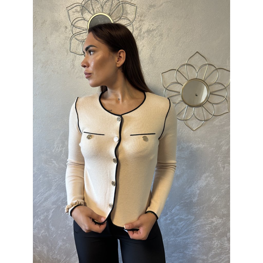 Dámský elegantní svetr ve dvou barevných provedeních – béžová s černým lemováním a světle hnědá s bílým lemováním. Tento stylový kousek je ideální pro každodenní nošení, ať už do práce, na schůzky, nebo volný čas. Svetr je vyroben z příjemného a pružného materiálu, který zajišťuje komfort a pohodlí po celý den. Zdobí ho decentní knoflíky ve zlaté barvě, které dodávají svetru stylový vzhled. Dvě falešné kapsy na přední straně jsou doplněny jemnými detaily, které podtrhují jednoduchost a eleganci tohoto modelu. Díky svému klasickému střihu se snadno kombinuje s různými kousky ve vašem šatníku, ať už se jedná o kalhoty, sukni nebo džíny.
