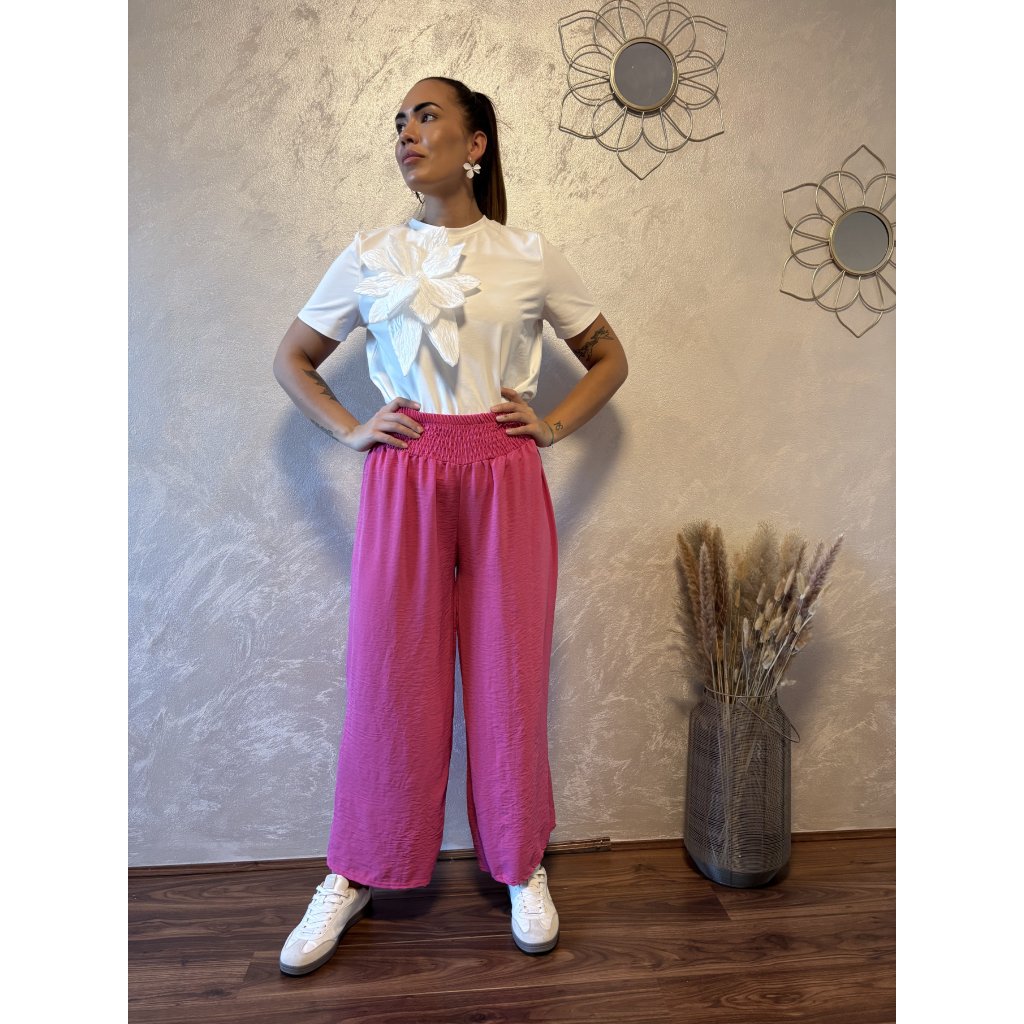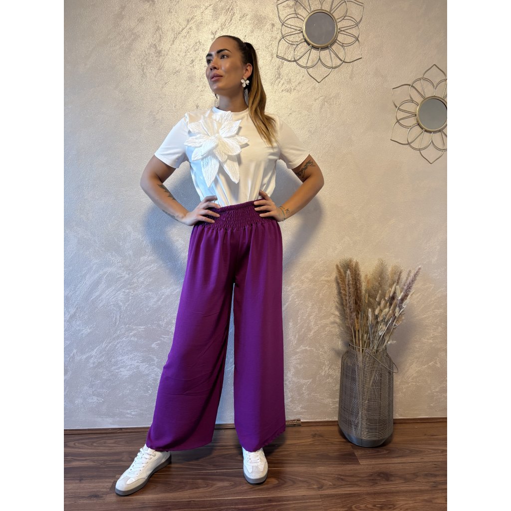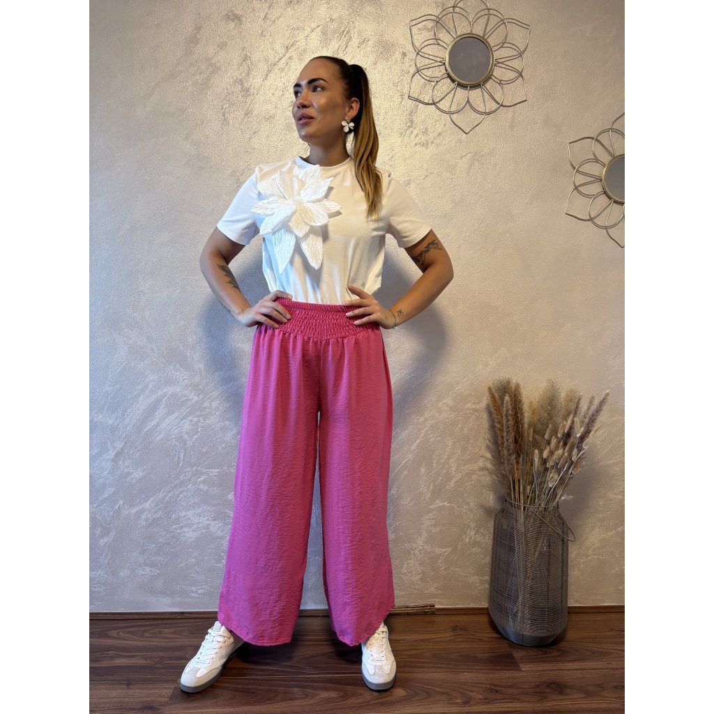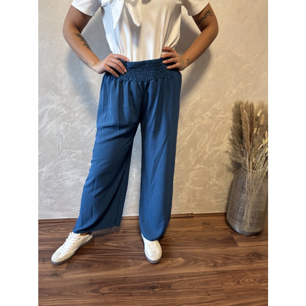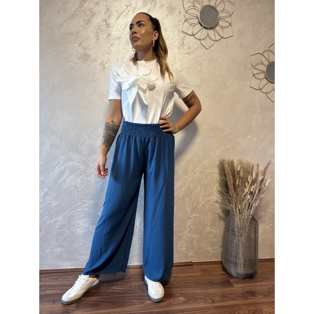 Kalhoty „Easy Chic“ – žabičkový pas, široké nohavice. Objevte pohodlí a styl v jednom – naše kalhoty „Easy Chic“ jsou ideálním společníkem pro každý den. Jsou vyrobené z lehkého, vzdušného materiálu, který se krásně přizpůsobí postavě díky žabičkovému pasu na gumu. Tento střih lichotí každé postavě a skvěle padne všem velikostem od S po XL. Kalhoty mají volné, široké nohavice, které dodávají outfitu uvolněný, ale stále elegantní vzhled. Výborně se kombinují s teniskami i sandálky a skvěle se hodí jak do města, tak na dovolenou.
