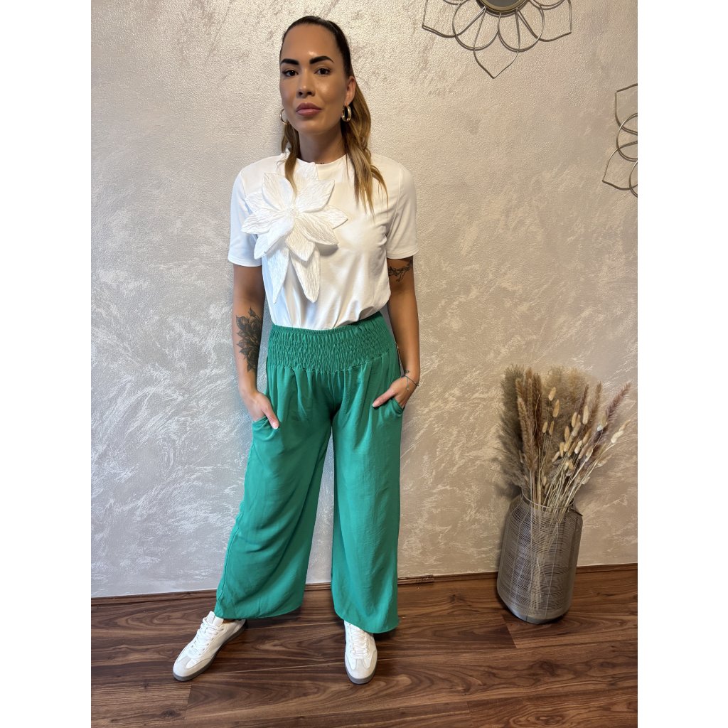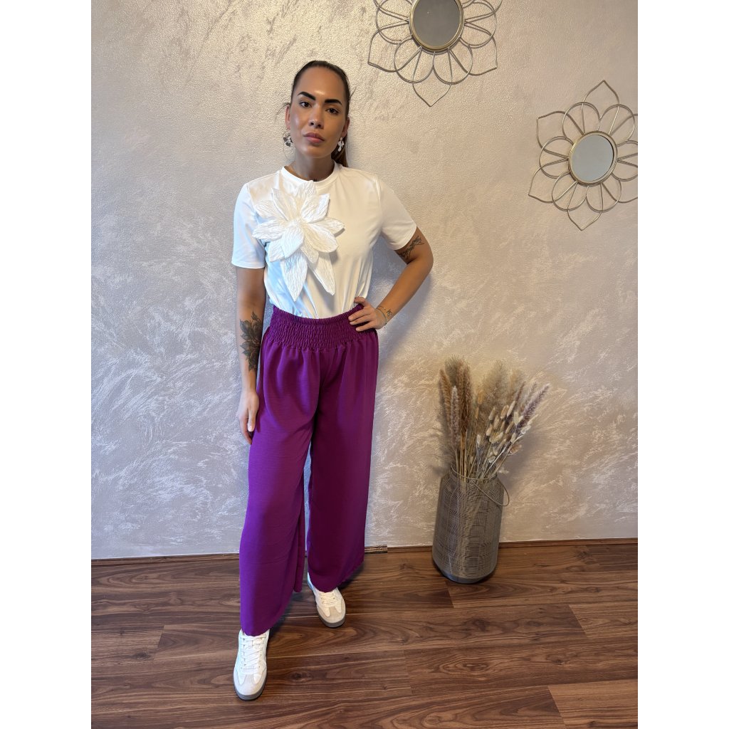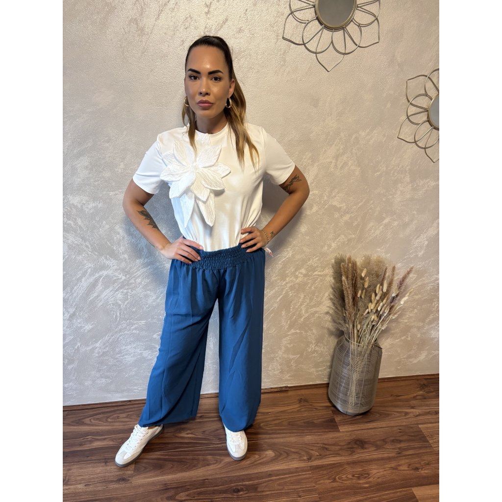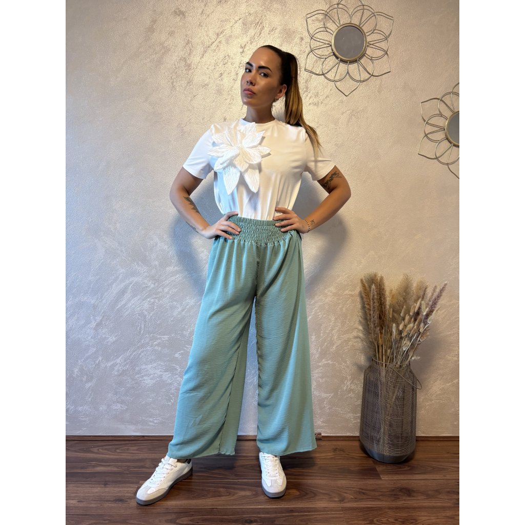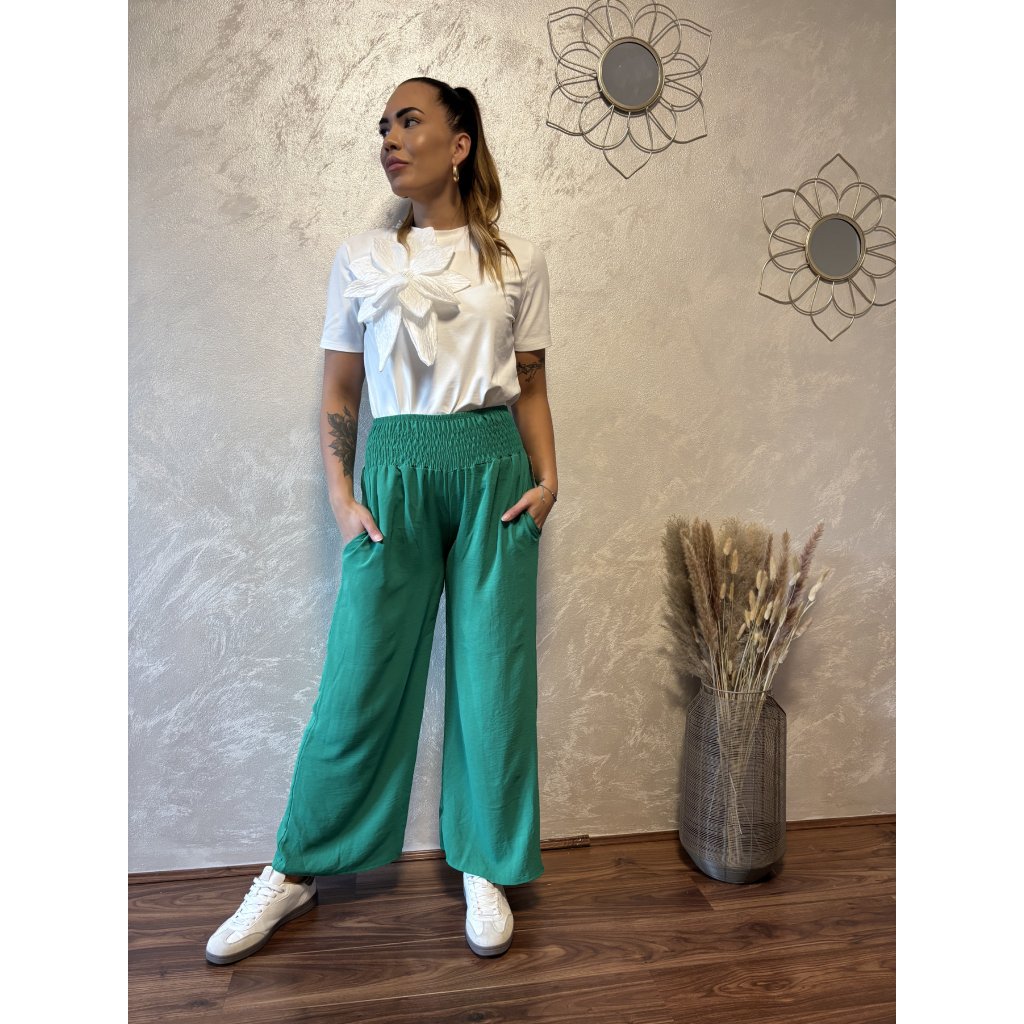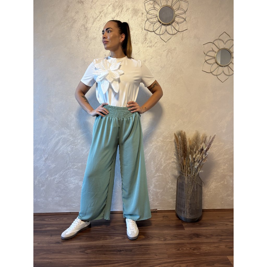 Kalhoty „Easy Chic“ – žabičkový pas, široké nohavice. Objevte pohodlí a styl v jednom – naše kalhoty „Easy Chic“ jsou ideálním společníkem pro každý den. Jsou vyrobené z lehkého, vzdušného materiálu, který se krásně přizpůsobí postavě díky žabičkovému pasu na gumu. Tento střih lichotí každé postavě a skvěle padne všem velikostem od S po XL. Kalhoty mají volné, široké nohavice, které dodávají outfitu uvolněný, ale stále elegantní vzhled. Výborně se kombinují s teniskami i sandálky a skvěle se hodí jak do města, tak na dovolenou.