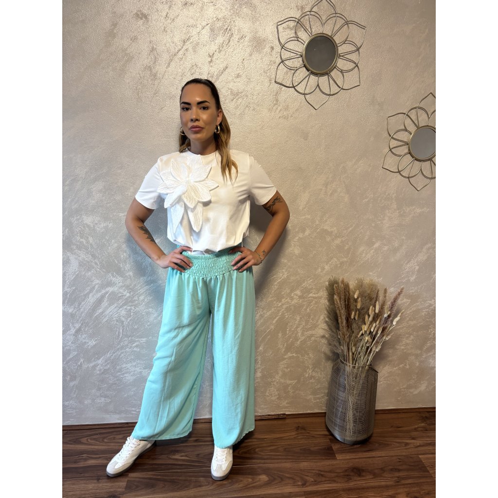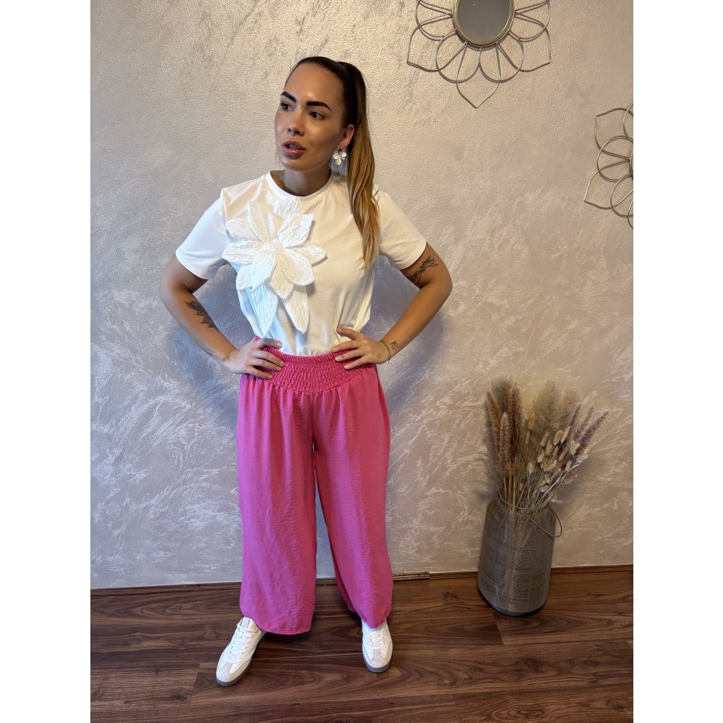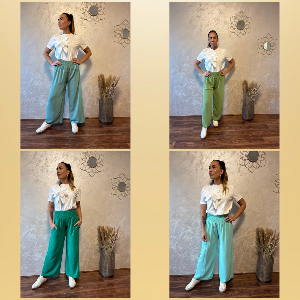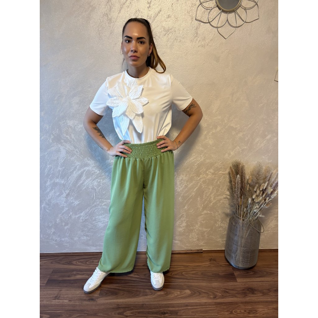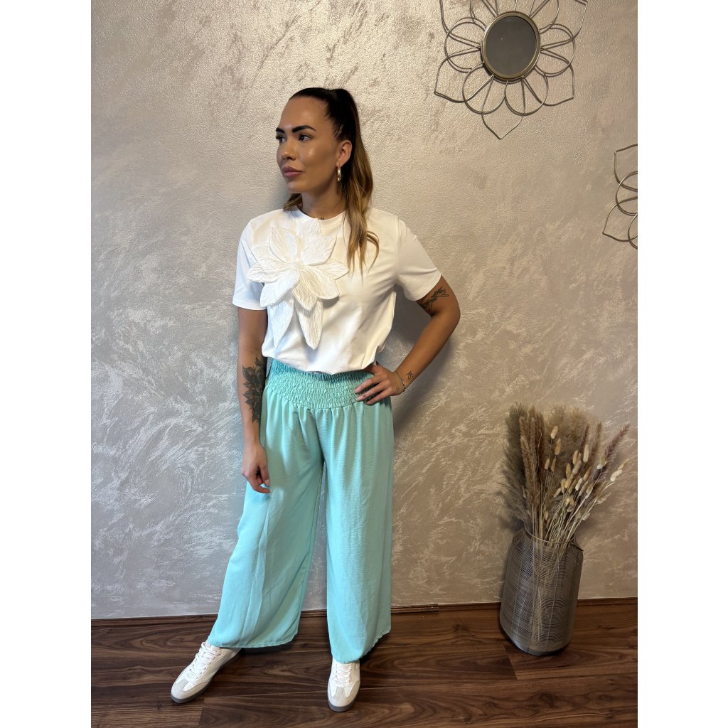 Kalhoty „Easy Chic“ – žabičkový pas, široké nohavice. Objevte pohodlí a styl v jednom – naše kalhoty „Easy Chic“ jsou ideálním společníkem pro každý den. Jsou vyrobené z lehkého, vzdušného materiálu, který se krásně přizpůsobí postavě díky žabičkovému pasu na gumu. Tento střih lichotí každé postavě a skvěle padne všem velikostem od S po XL. Kalhoty mají volné, široké nohavice, které dodávají outfitu uvolněný, ale stále elegantní vzhled. Výborně se kombinují s teniskami i sandálky a skvěle se hodí jak do města, tak na dovolenou.