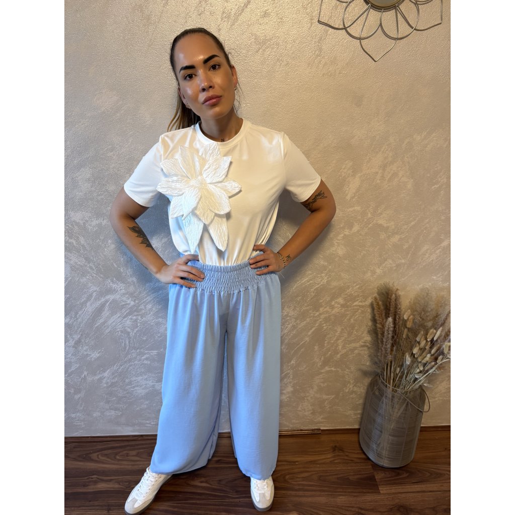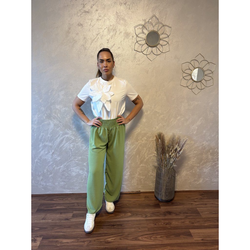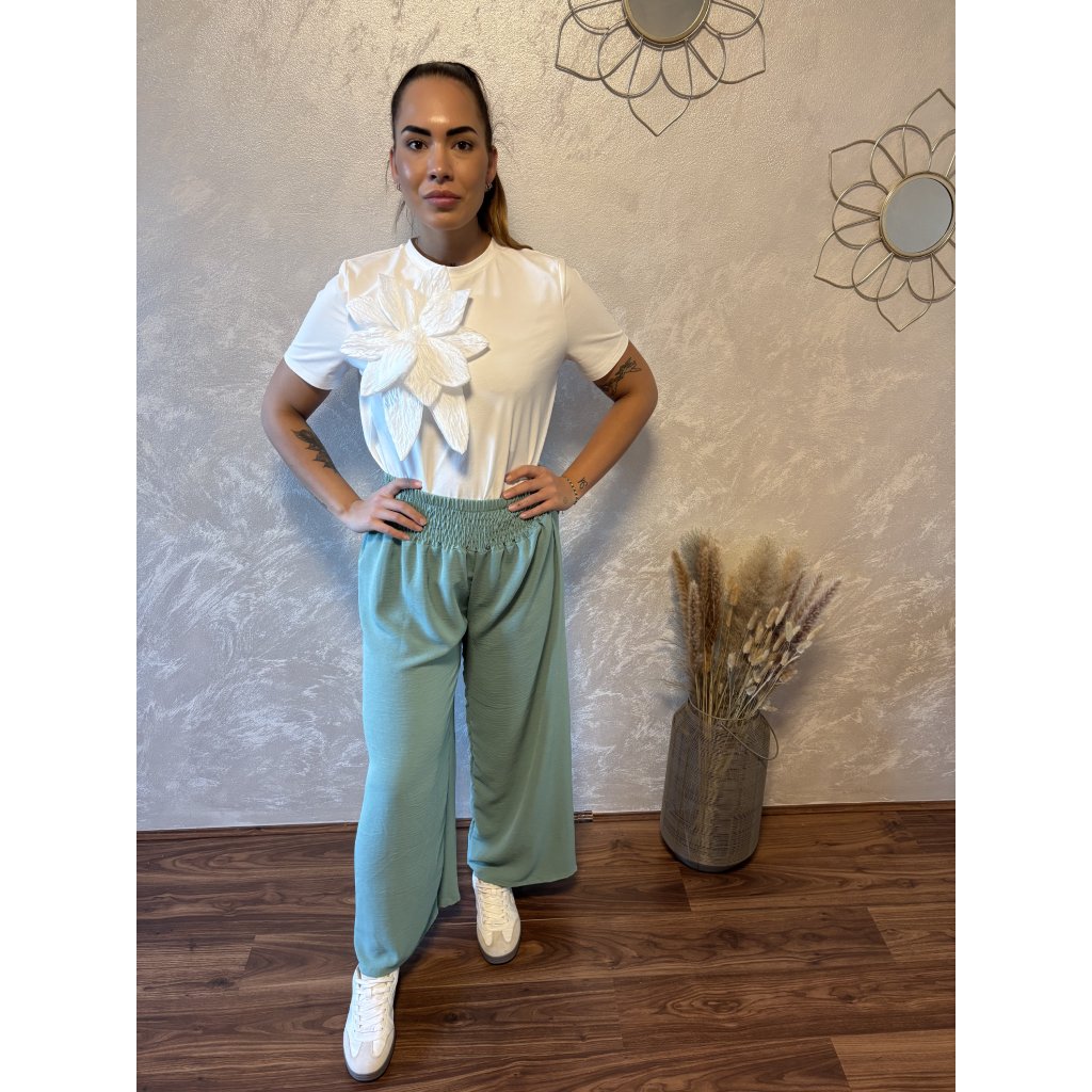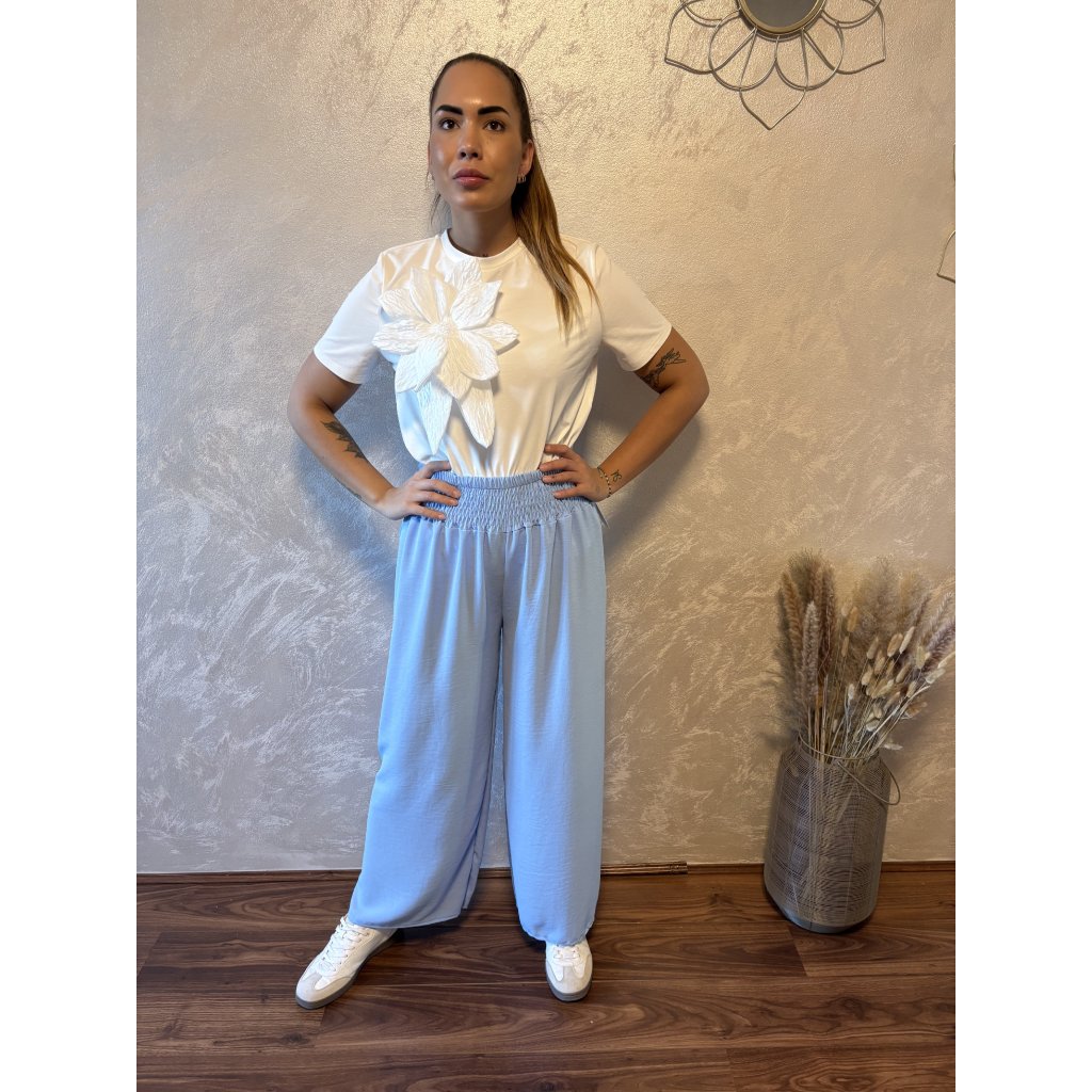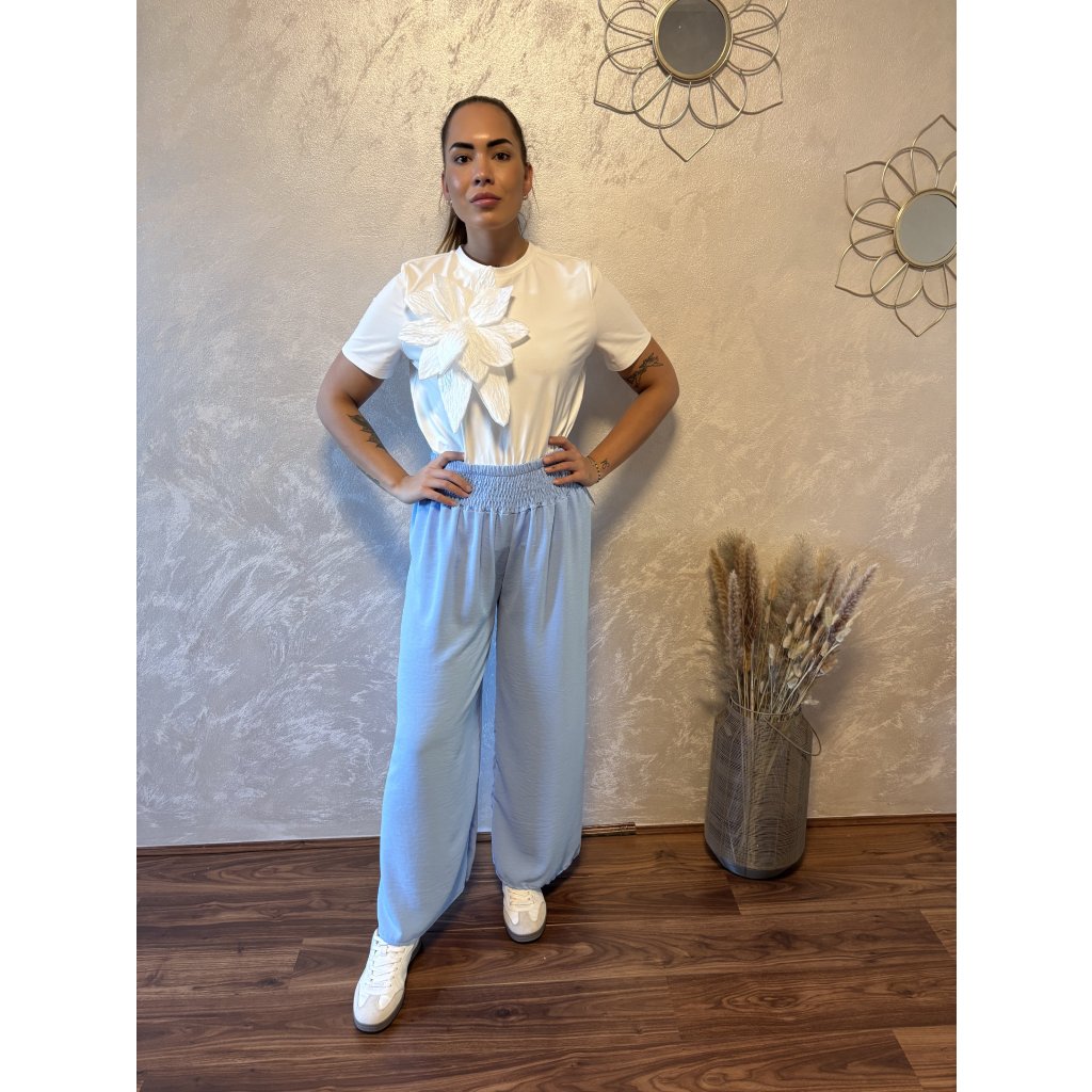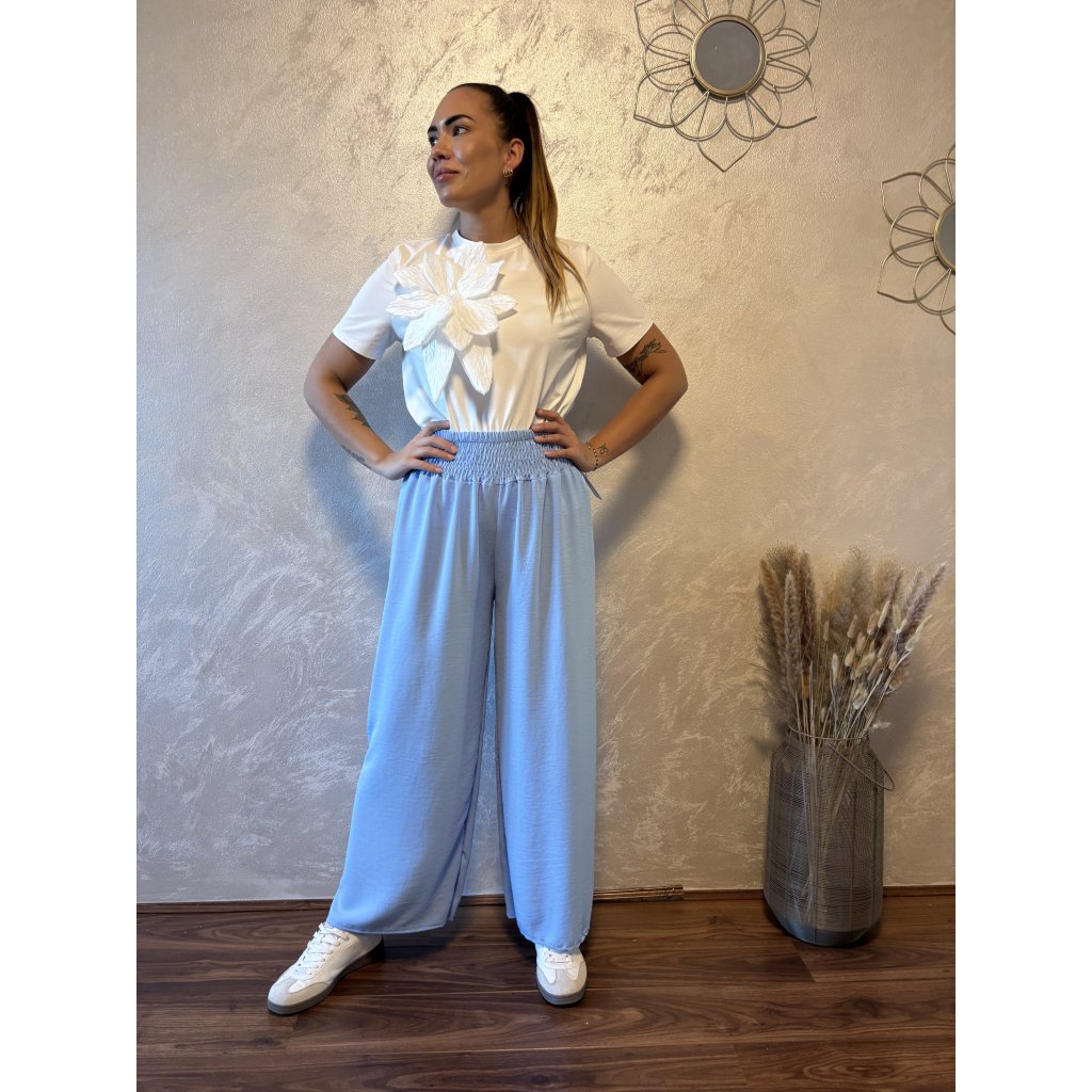 Kalhoty „Easy Chic“ – žabičkový pas, široké nohavice. Objevte pohodlí a styl v jednom – naše kalhoty „Easy Chic“ jsou ideálním společníkem pro každý den. Jsou vyrobené z lehkého, vzdušného materiálu, který se krásně přizpůsobí postavě díky žabičkovému pasu na gumu. Tento střih lichotí každé postavě a skvěle padne všem velikostem od S po XL. Kalhoty mají volné, široké nohavice, které dodávají outfitu uvolněný, ale stále elegantní vzhled. Výborně se kombinují s teniskami i sandálky a skvěle se hodí jak do města, tak na dovolenou.