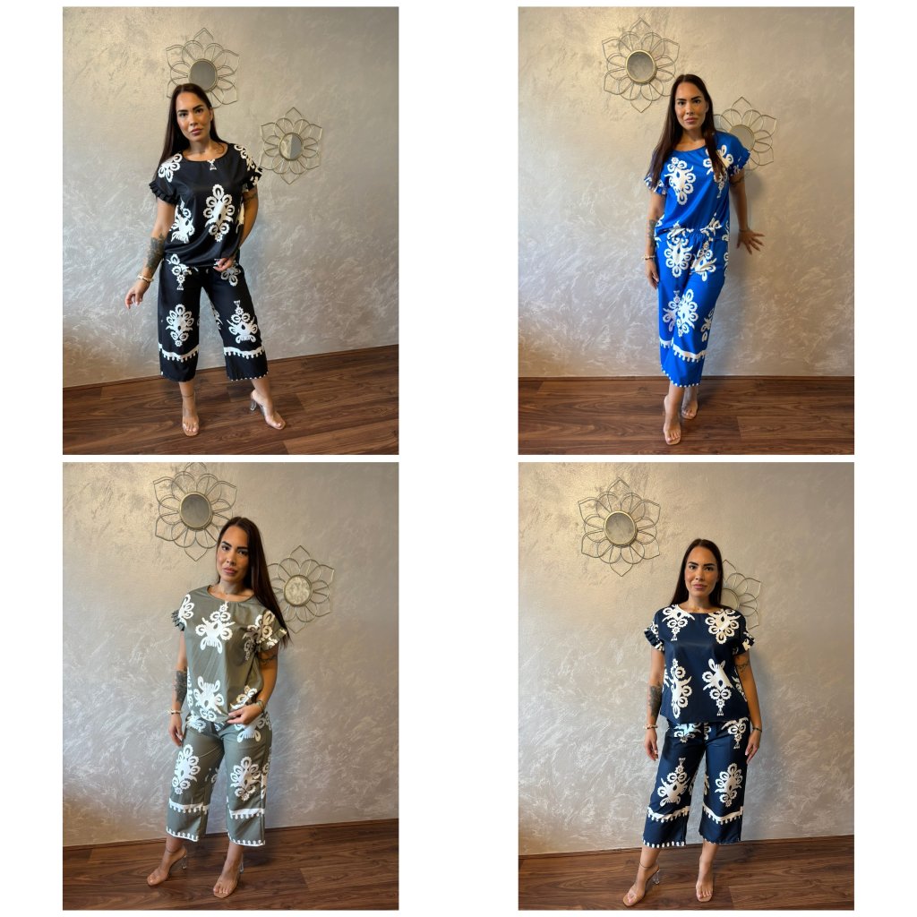 Střih: volnější halenka s krátkými rukávy a tříčtvrtečními kalhoty