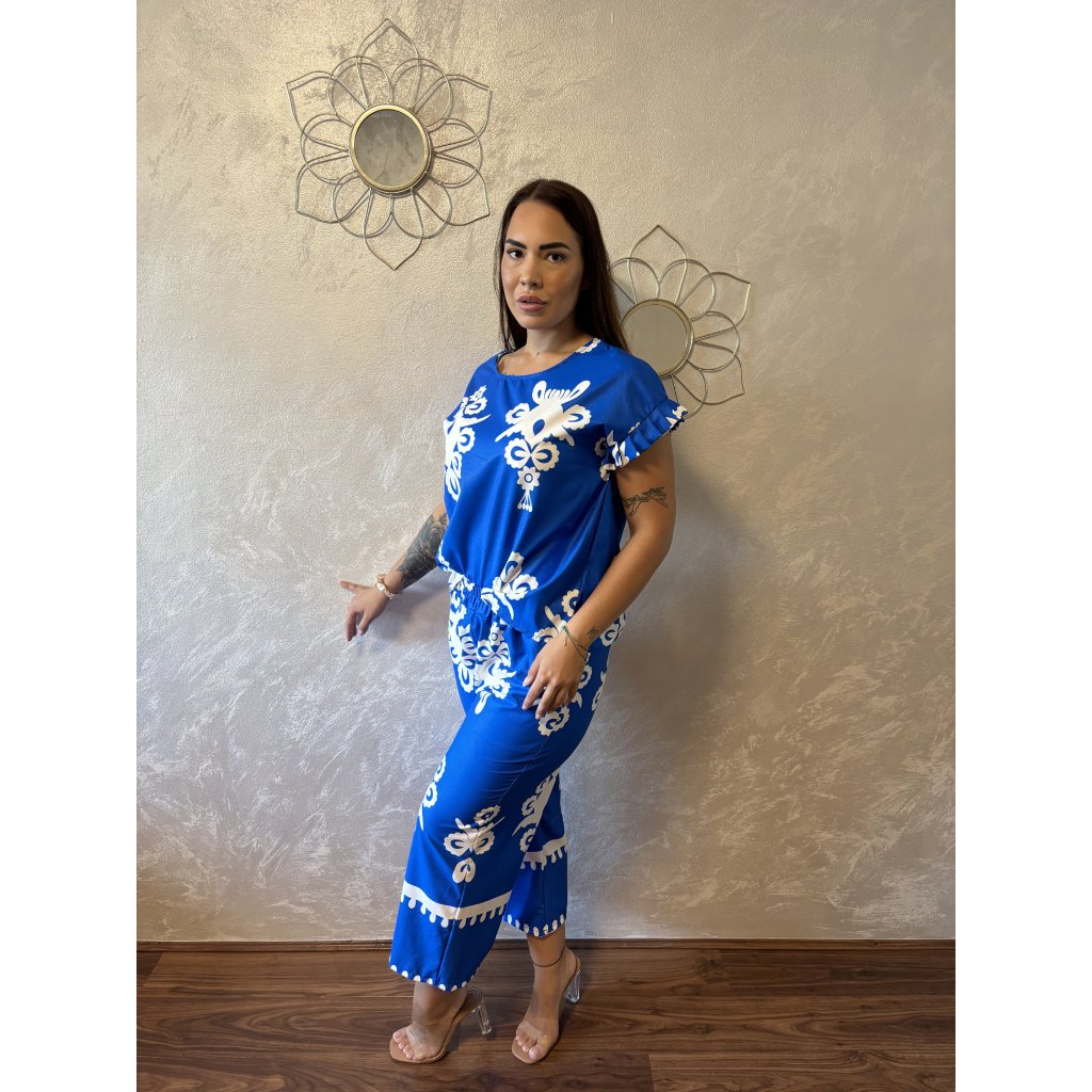 Tento stylový komplet v černé barvě je zdoben výrazným bílým květinovým vzorem, který zaujme na první pohled. Sada se skládá z lehké, volnější haleny s krátkými rukávy s jemným řasením a pohodlných tříčtvrtečních kalhot. Materiál je příjemný na dotek a zajišťuje pohodlné nošení po celý den. Kalhoty jsou v pase na gumu, která se hezky natáhne. Velikost je univerzální, sedí od XS po XL.