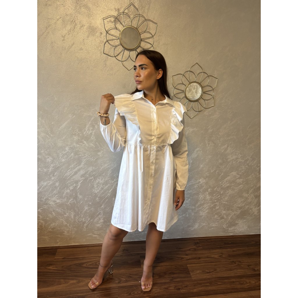 Tyto stylové košilové šaty přináší moderní eleganci díky výrazným volánovým detailům na přední části. Dlouhé rukávy zakončené do gumičky a límeček dodávají šatům elegantní vzhled, zatímco volný střih zajišťuje pohodlí při nošení. S jednoduchým střihem a zapínáním na knoflíky po celé délce jsou šaty pohodlné a vhodné jak pro každodenní nošení, tak pro speciální příležitosti. K dispozici ve dvou klasických barvách – bílá a krémová, které podtrhují jejich nadčasovost a univerzálnost. Tyto nadčasové šaty skvěle doplní váš šatník a nabídnou maximální komfort i styl!