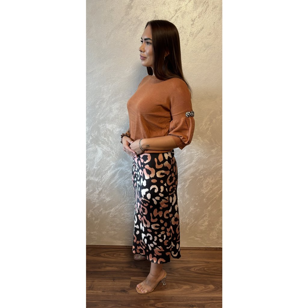 Dodejte svému outfitu šmrnc s touto výraznou vzorovanou sukní. Sukně je ve střihu midi, což je ideální délka pro pohodlné nošení při každodenních příležitostech i speciálních událostech. Zajímavý leopardí potisk v jemných odstínech cihlové a černé zajišťuje, že se sukně stane dominantním prvkem každého outfitu. Je vyrobena z příjemného a lehkého materiálu, který zaručuje pohodlí po celý den.