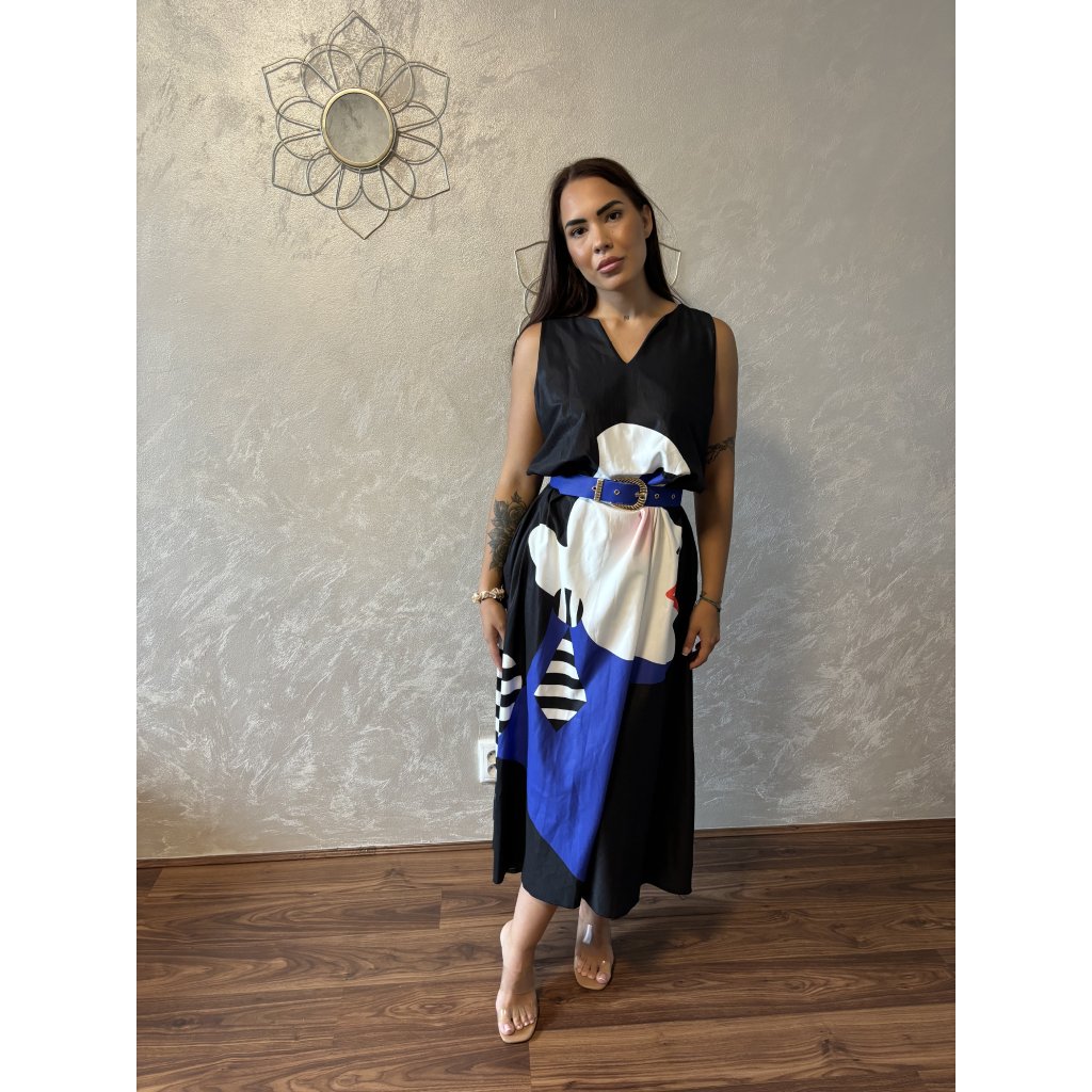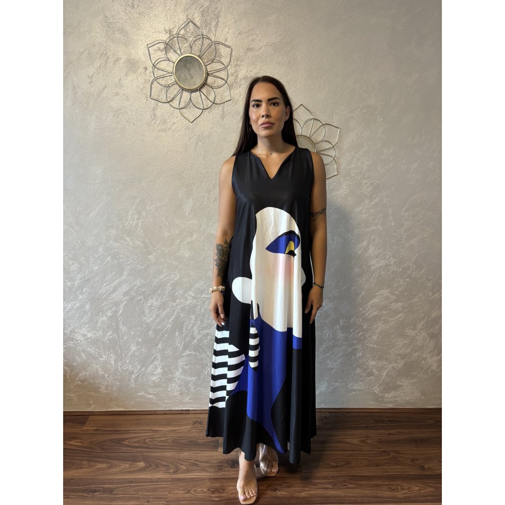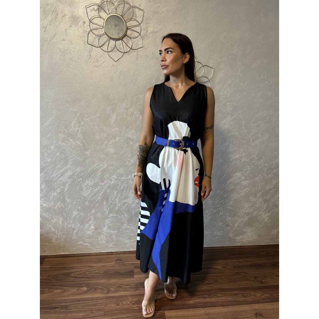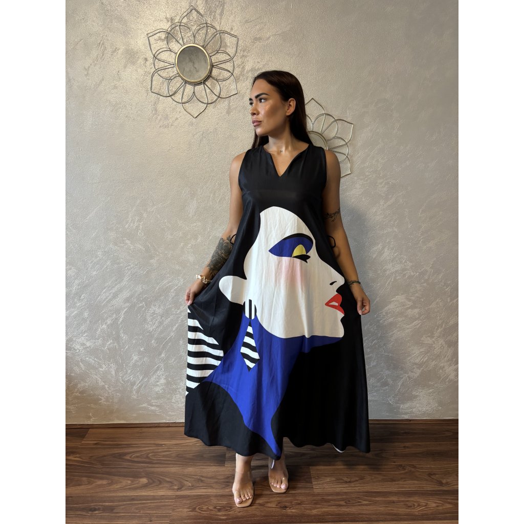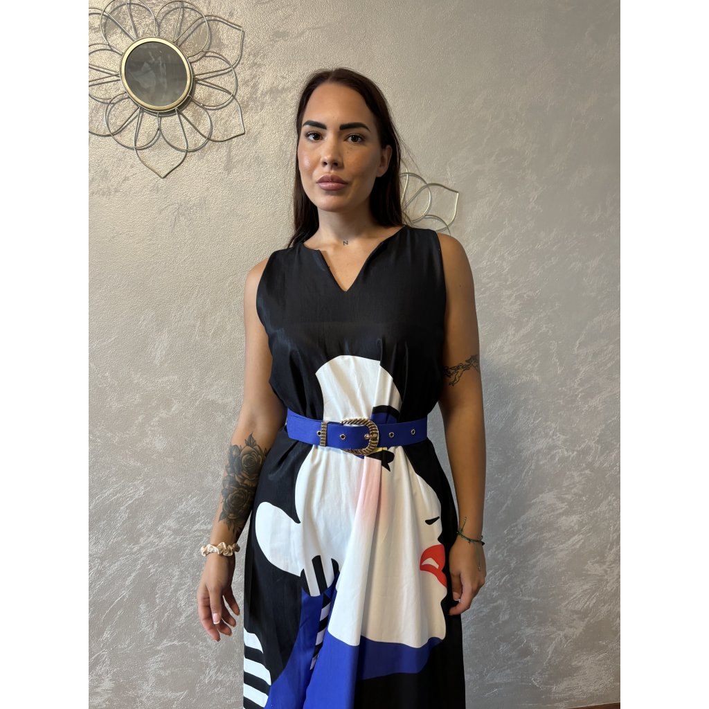 Zářivé a stylové letní šaty „ART DECO FACE“ přinášejí originalitu a pohodlí v jednom. Volný áčkový střih lichotí každé postavě a výrazný umělecký potisk v kombinaci s fialovým páskem zvýrazní váš pas. Šaty mají výstřih do „V“, praktické kapsy a jsou ideální na letní procházky, dovolenou i městské dny plné stylu. Součástí balení je modrý látkový pásek se zlatou kovovou přezkou.