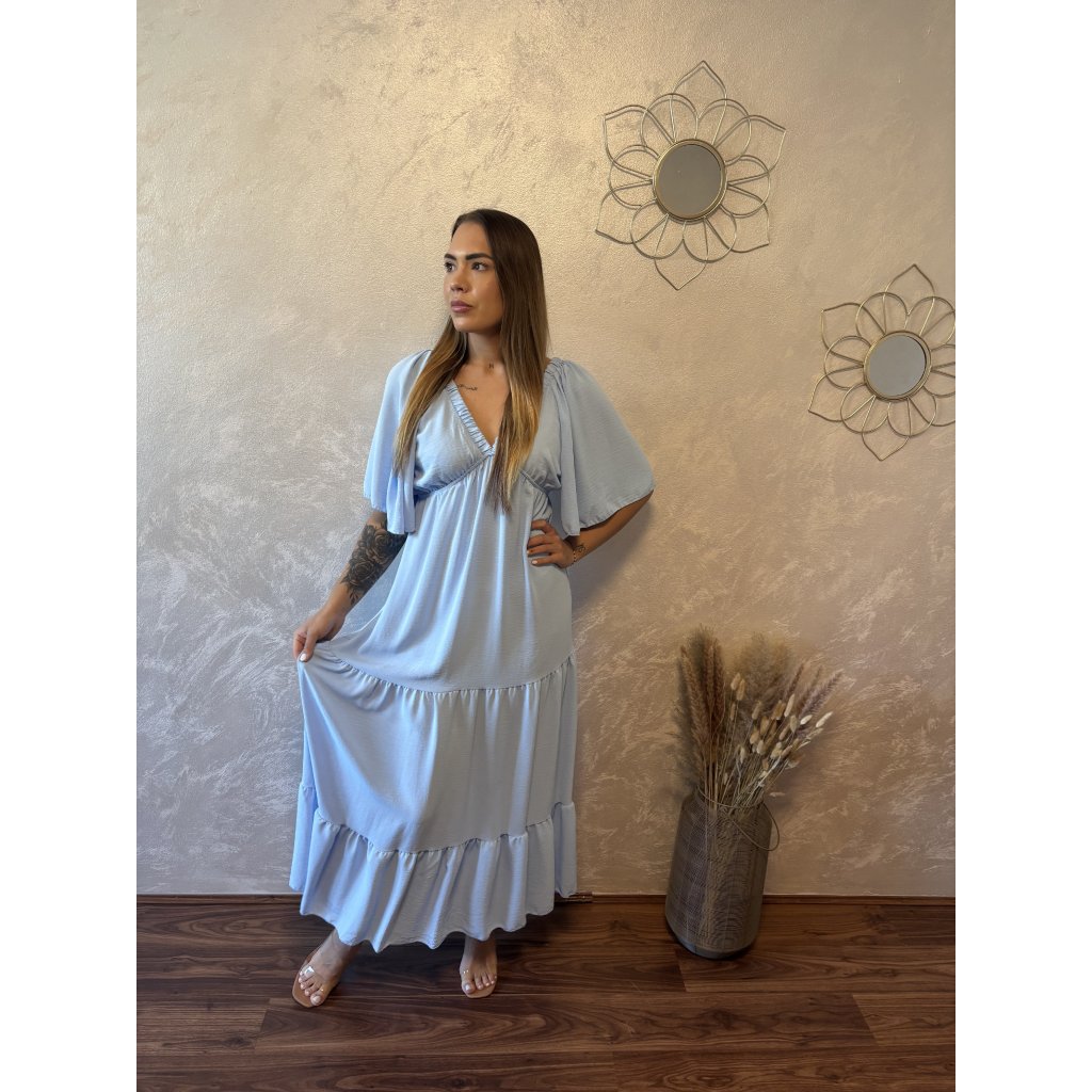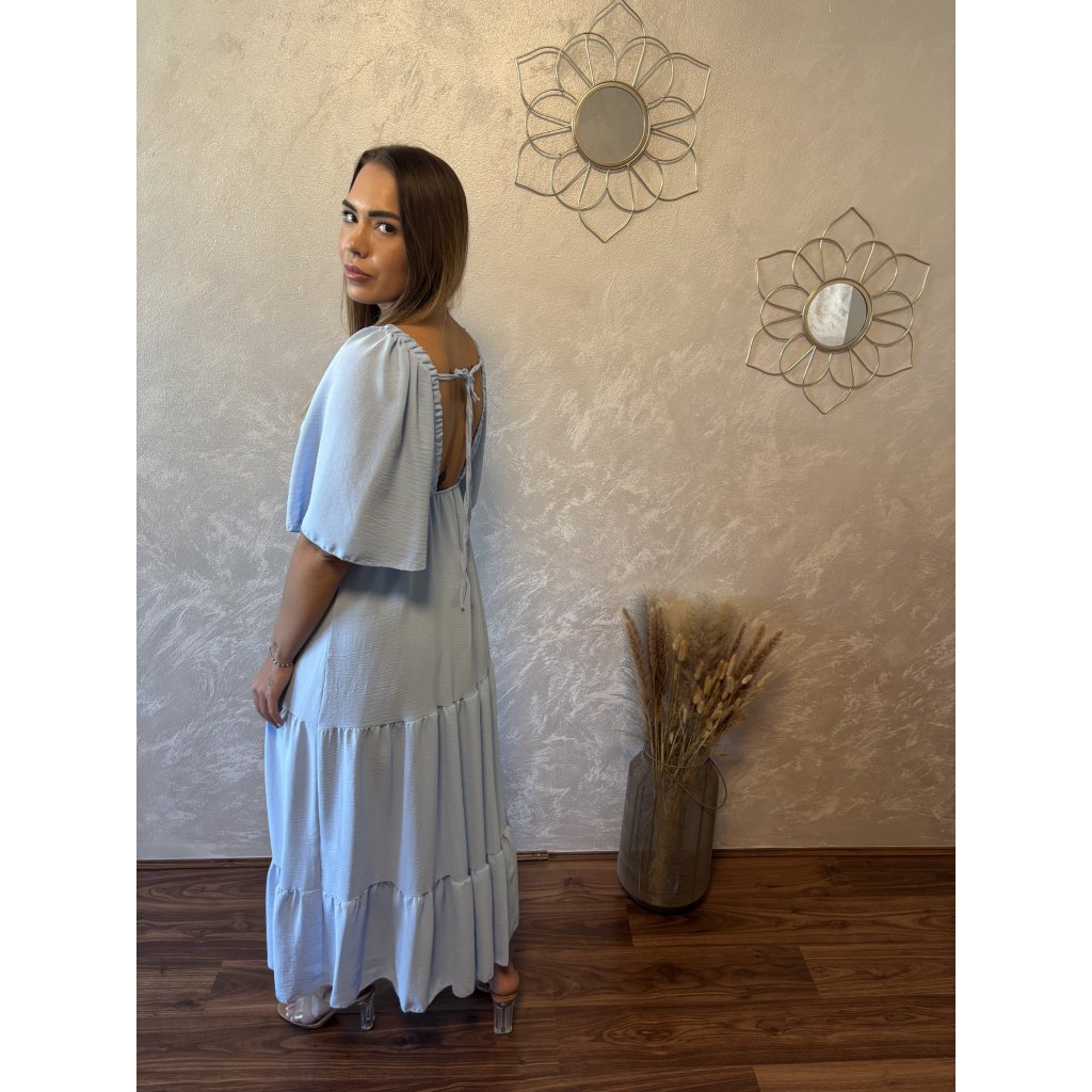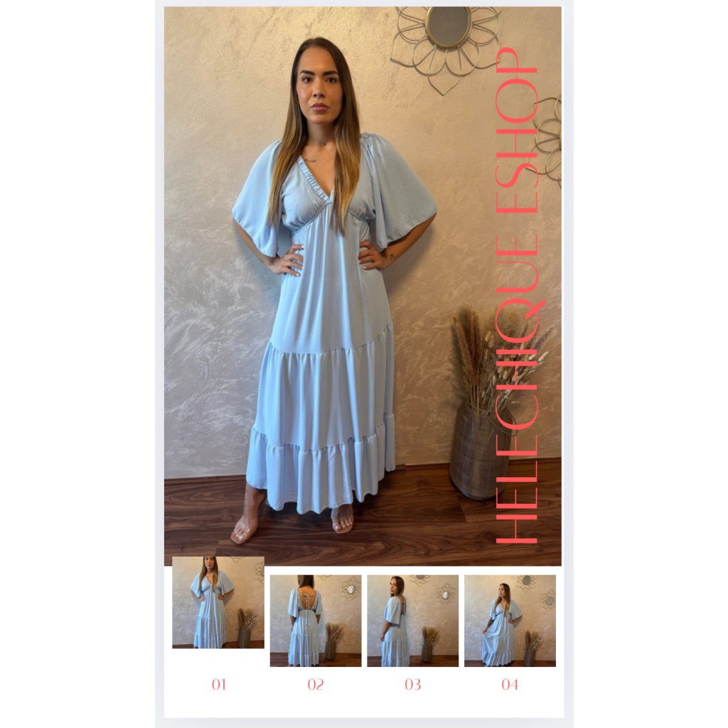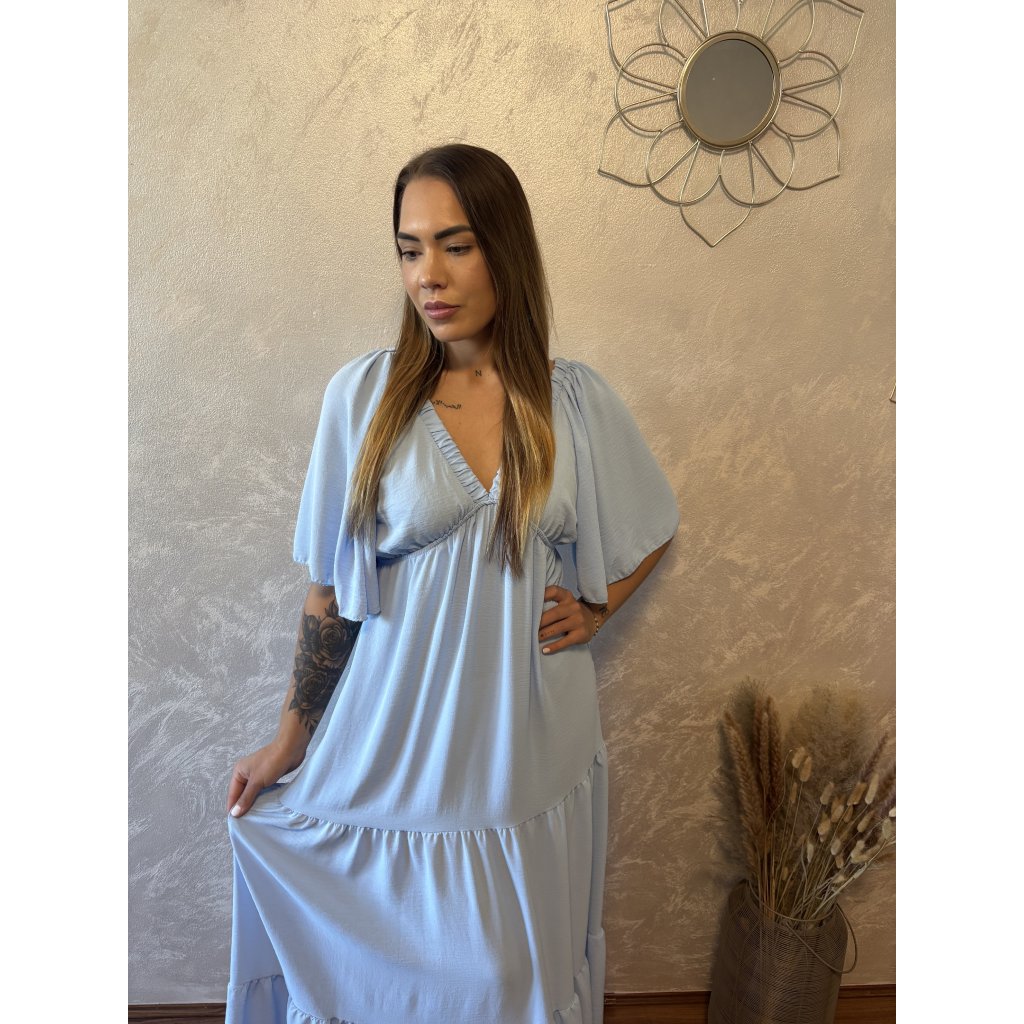 Vzdušné, elegantní a neuvěřitelně pohodlné – to jsou naše Sky maxi šaty ve světle modré barvě. Volný střih s efektními volány, širokými rukávy a jemným výstřihem lichotí každé postavě. Zajímavým detailem je šněrování na zádech, které dodává šatům šmrnc i variabilitu při nošení. Ideální volba na letní procházky, dovolenou i stylové posezení s přáteli. Tip: Skvěle ladí s páskovými sandály nebo espadrilkami.