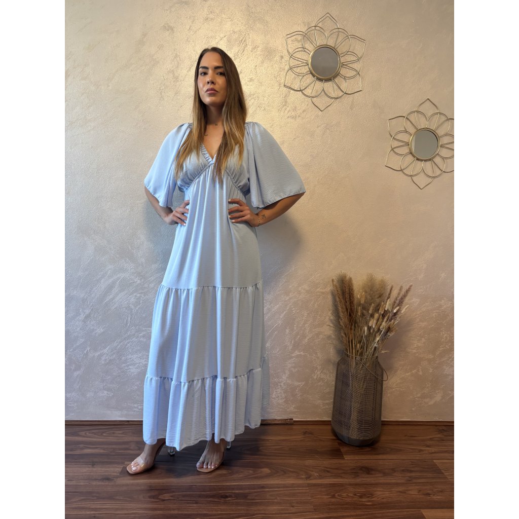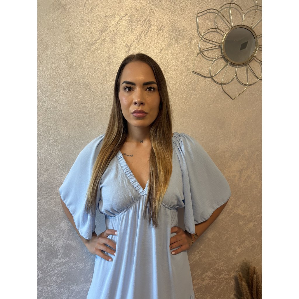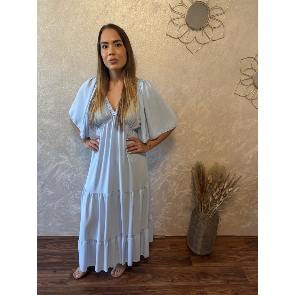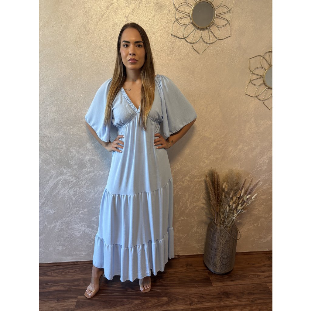 Vzdušné, elegantní a neuvěřitelně pohodlné – to jsou naše Sky maxi šaty ve světle modré barvě. Volný střih s efektními volány, širokými rukávy a jemným výstřihem lichotí každé postavě. Zajímavým detailem je šněrování na zádech, které dodává šatům šmrnc i variabilitu při nošení. Ideální volba na letní procházky, dovolenou i stylové posezení s přáteli. Tip: Skvěle ladí s páskovými sandály nebo espadrilkami.