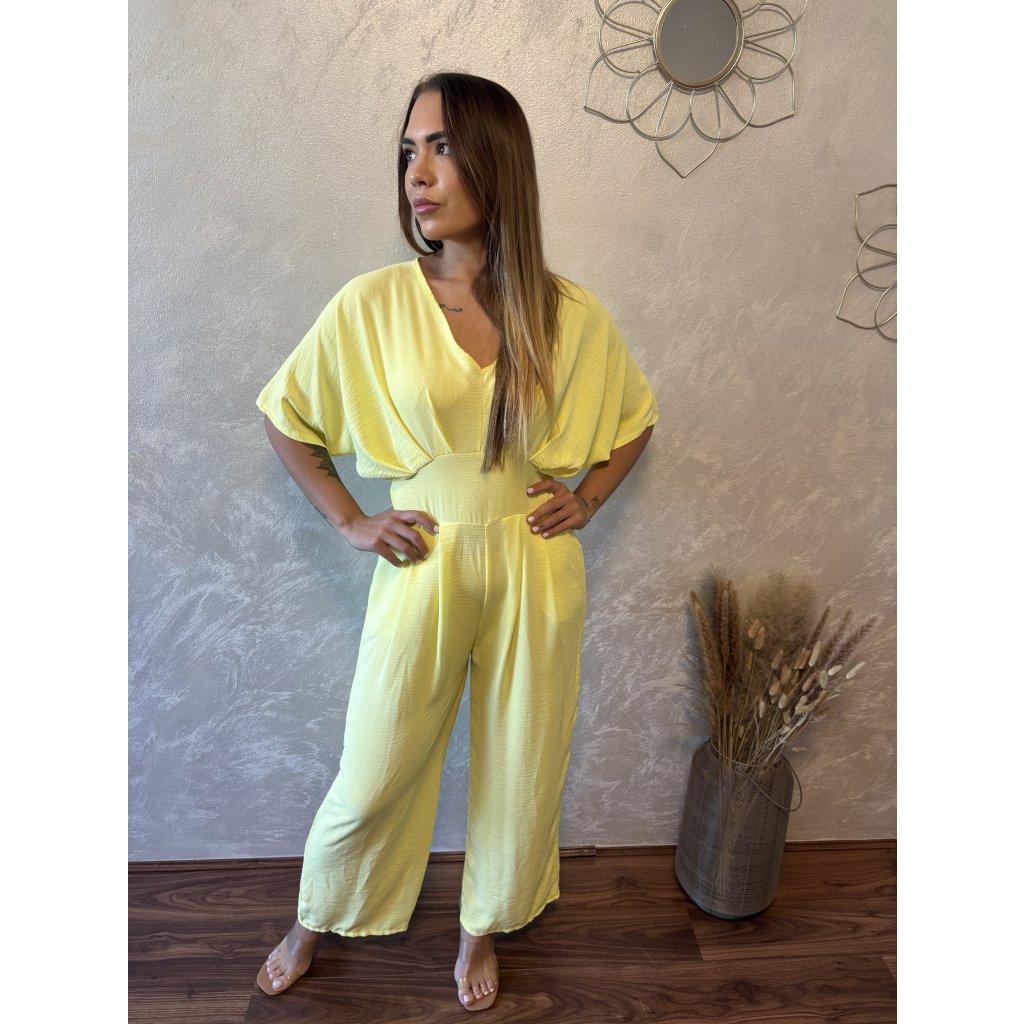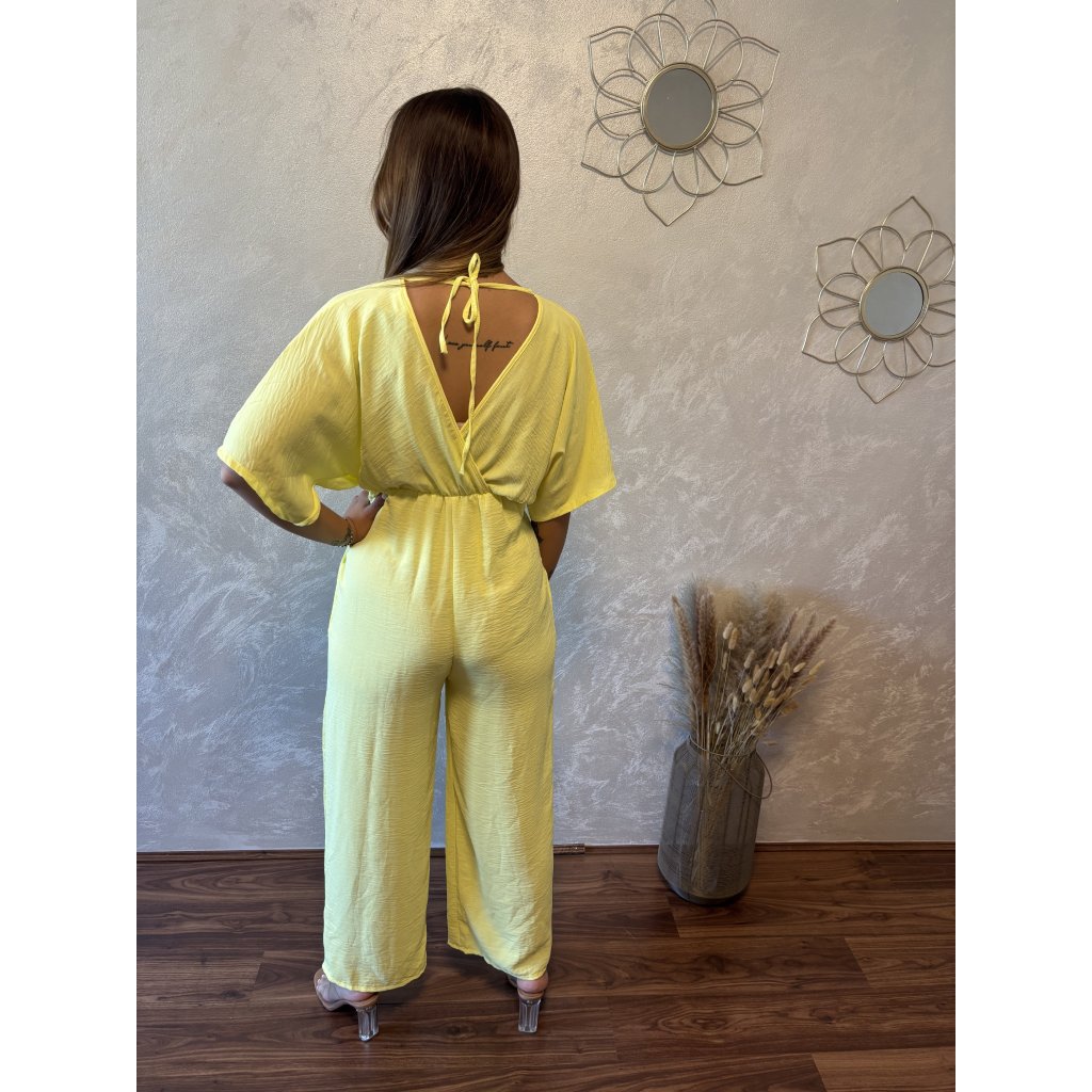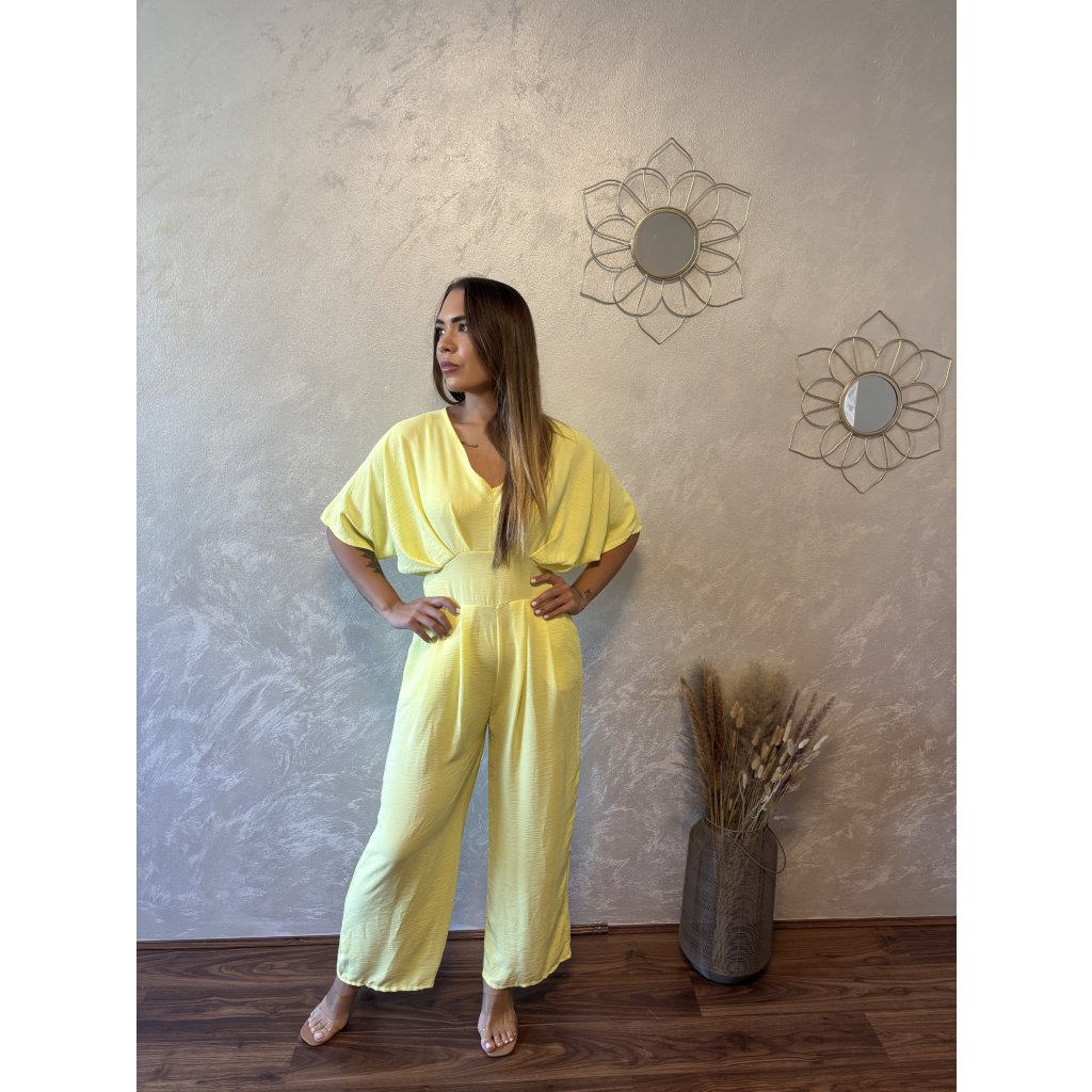 Rozjasněte svůj den s overálem Sunny Breeze! Tento stylový kousek v jemně žlutém odstínu je ušitý z lehkého a příjemného materiálu, který krásně splývá a poskytuje naprosté pohodlí. Volný střih s hlubokým výstřihem do „V“ vpředu i vzadu působí elegantně a zároveň nenuceně. Guma v pase zvýrazní siluetu, zatímco široké nohavice dodávají outfitu ležérní šmrnc. Ideální na letní dny, dovolenou, procházku městem nebo stylový brunch. Díky univerzální velikosti perfektně padne různým typům postav.