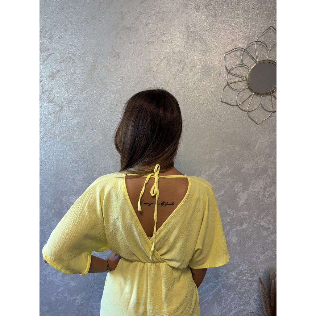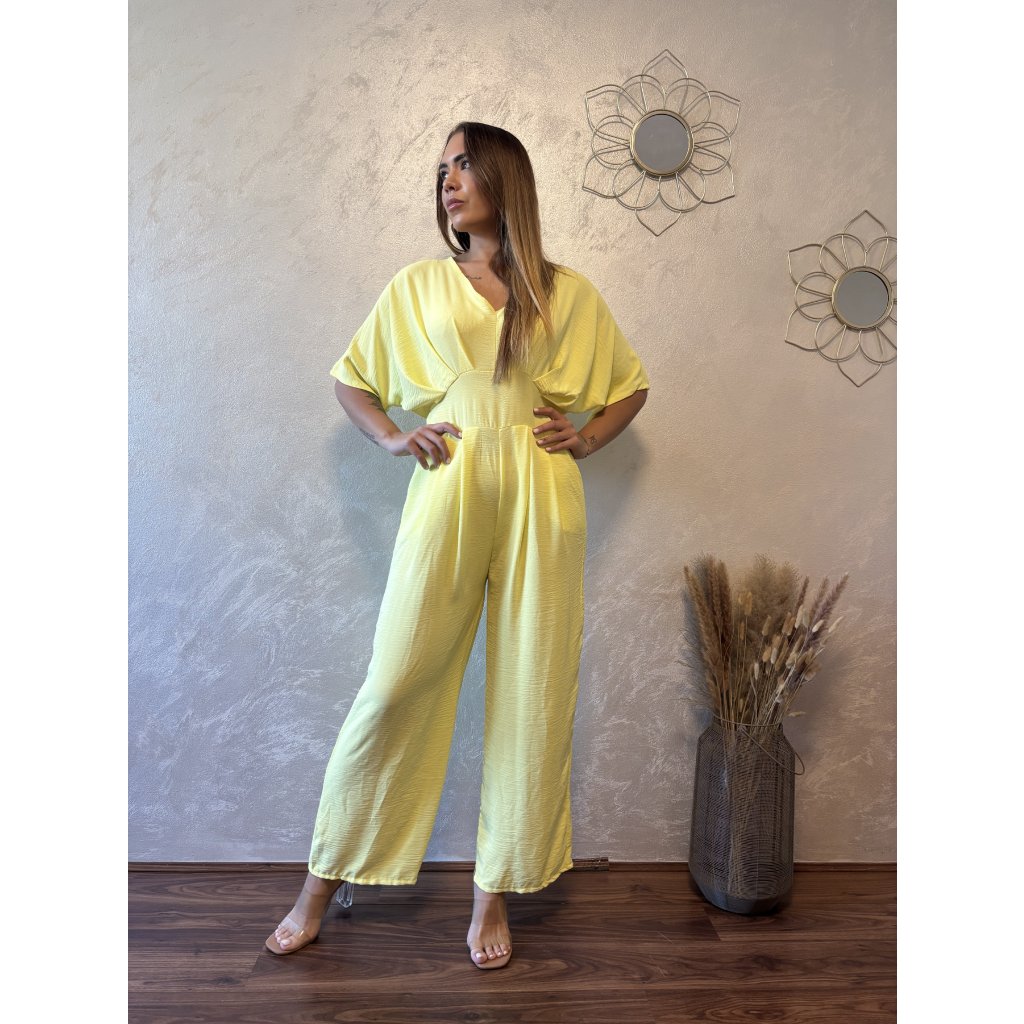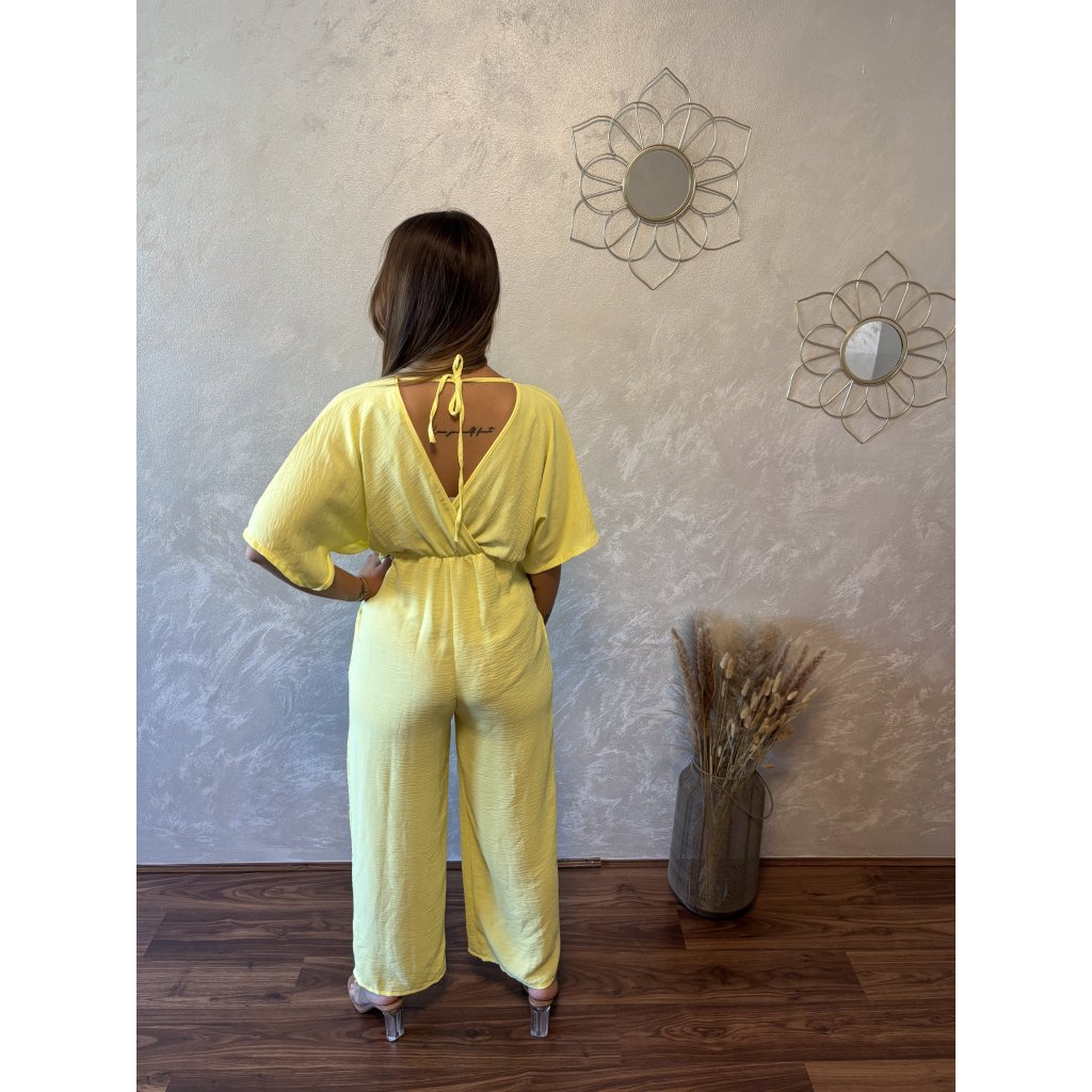 Rozjasněte svůj den s overálem Sunny Breeze! Tento stylový kousek v jemně žlutém odstínu je ušitý z lehkého a příjemného materiálu, který krásně splývá a poskytuje naprosté pohodlí. Volný střih s hlubokým výstřihem do „V“ vpředu i vzadu působí elegantně a zároveň nenuceně. Guma v pase zvýrazní siluetu, zatímco široké nohavice dodávají outfitu ležérní šmrnc. Ideální na letní dny, dovolenou, procházku městem nebo stylový brunch. Díky univerzální velikosti perfektně padne různým typům postav.