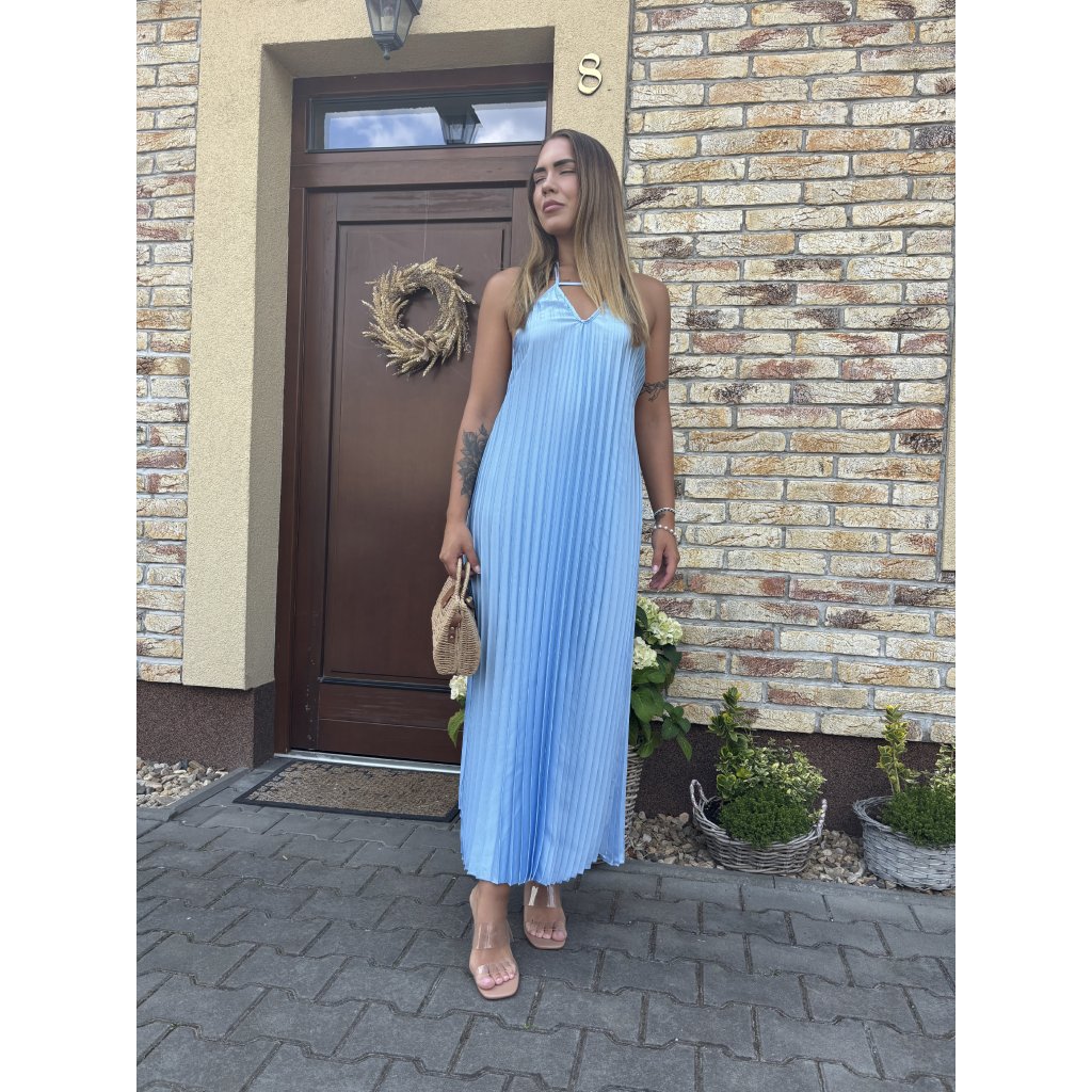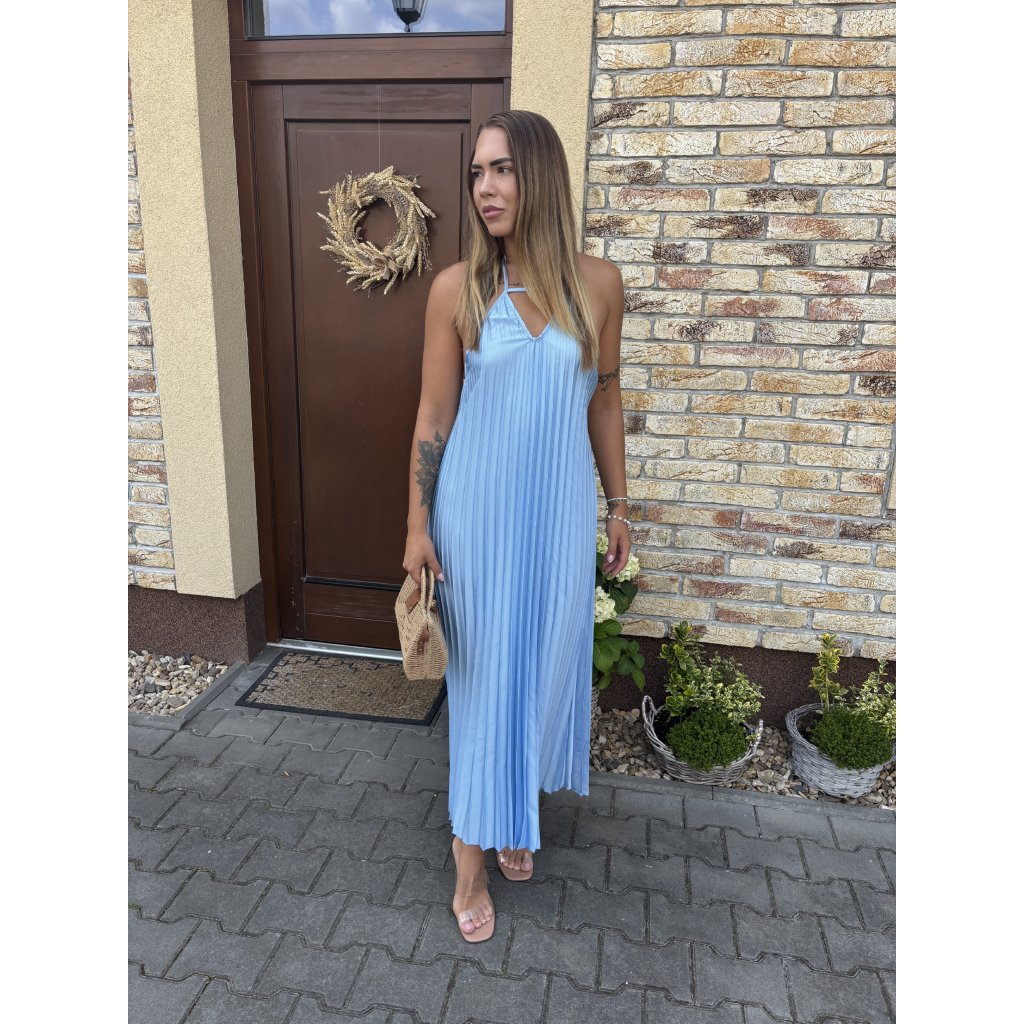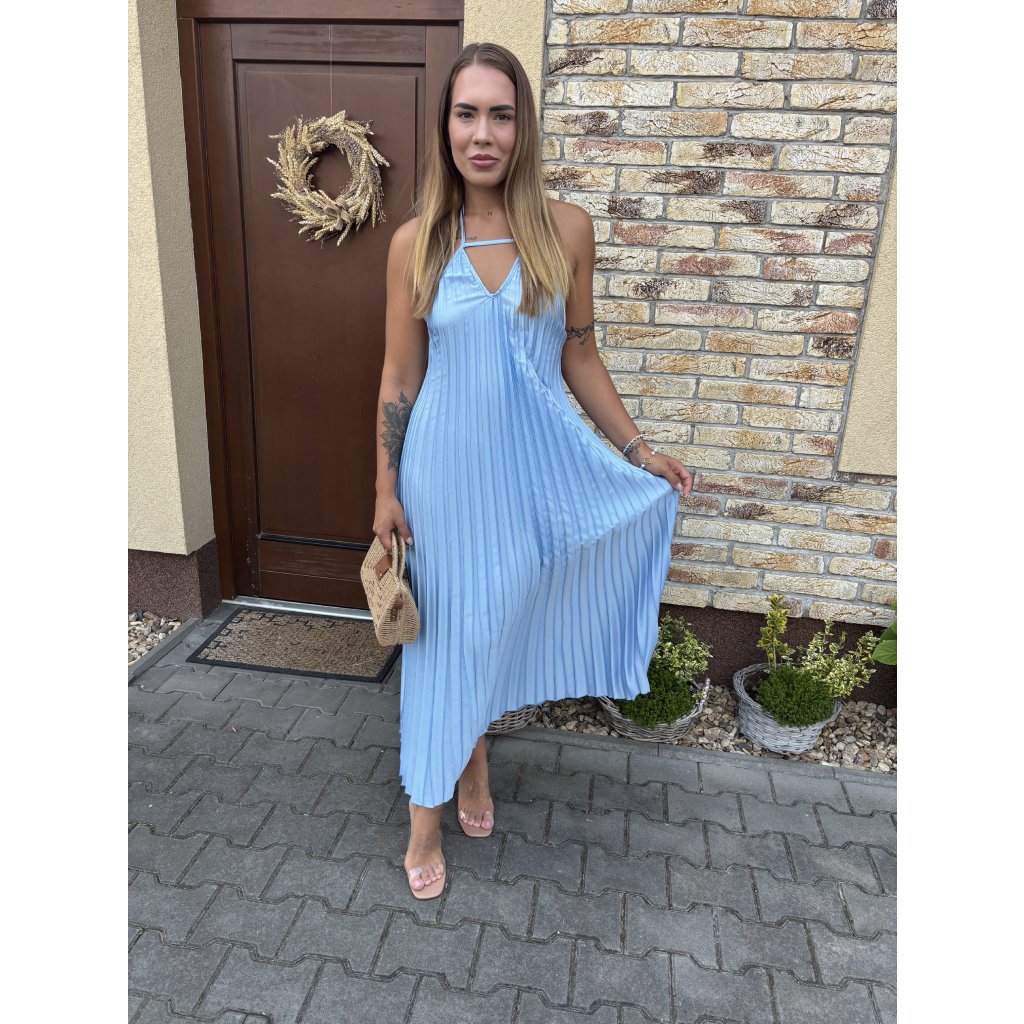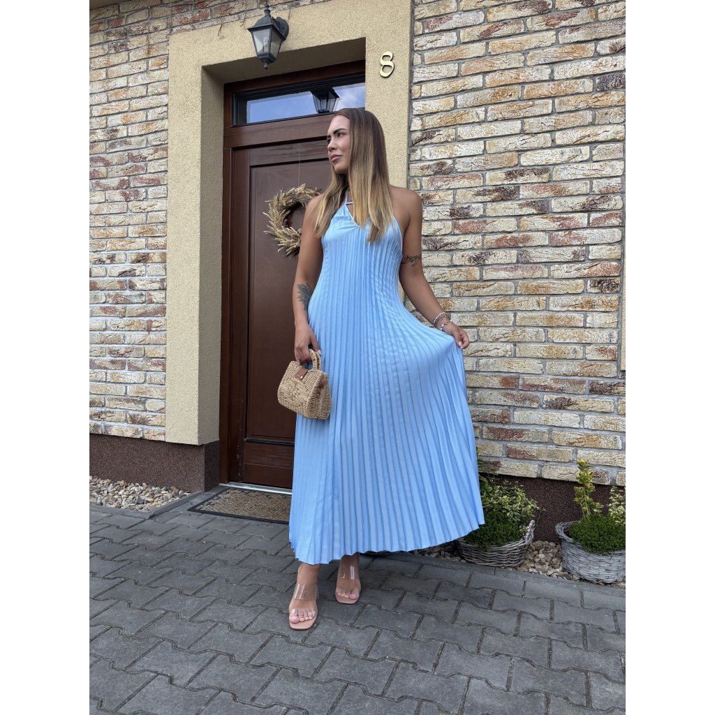 Vstupte do léta s lehkostí v těchto vzdušných plisovaných šatech „Luna Sky“. Jemný pastelově modrý odstín připomíná klidné nebe při úplňku, zatímco rafinovaný halter střih a padavý plisovaný materiál dodávají šatům ženskost a šarm. Ideální na procházku městem, letní večeři nebo dovolenou u moře.