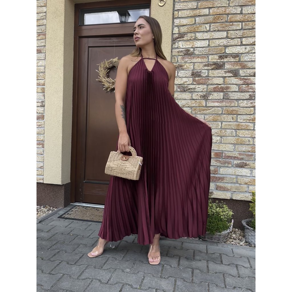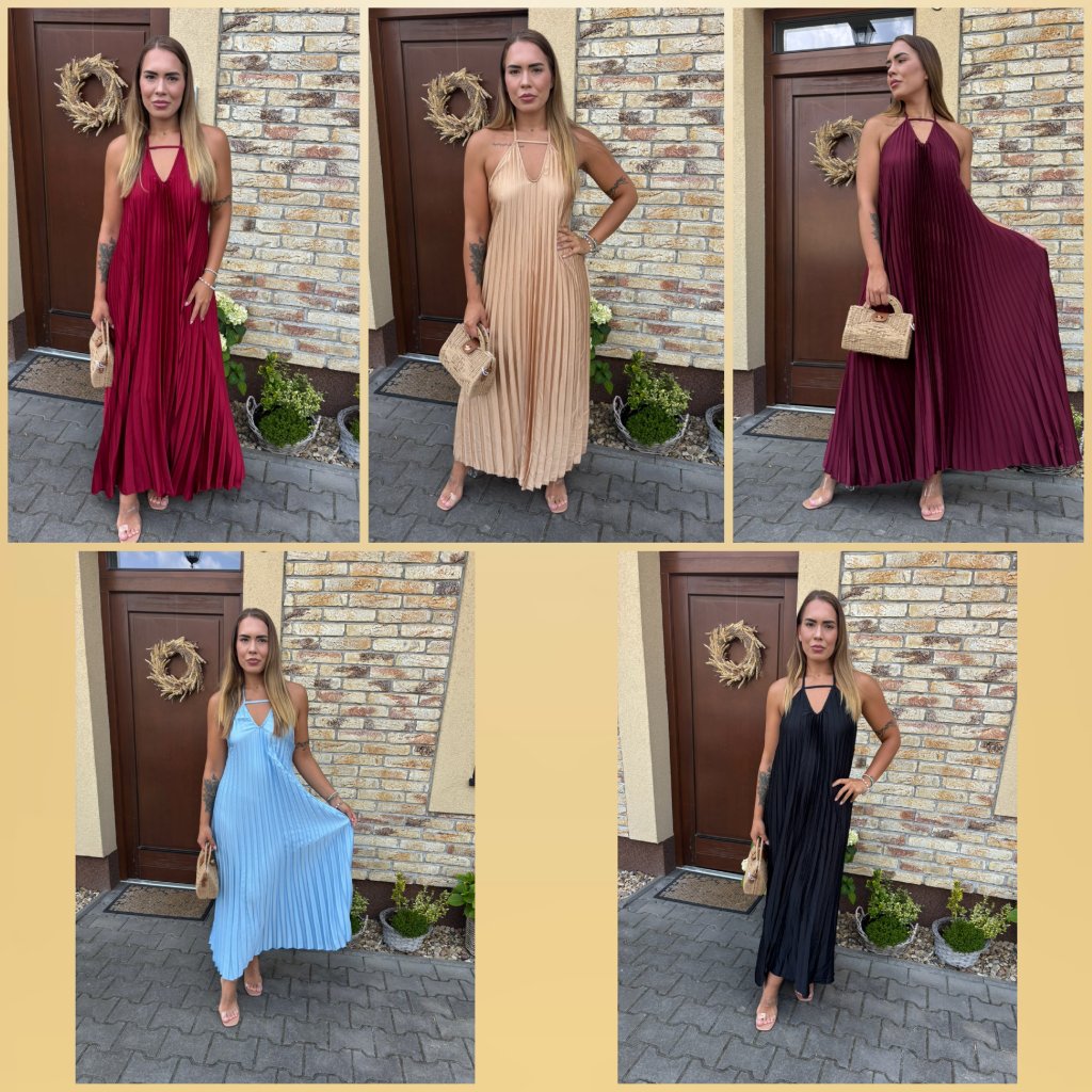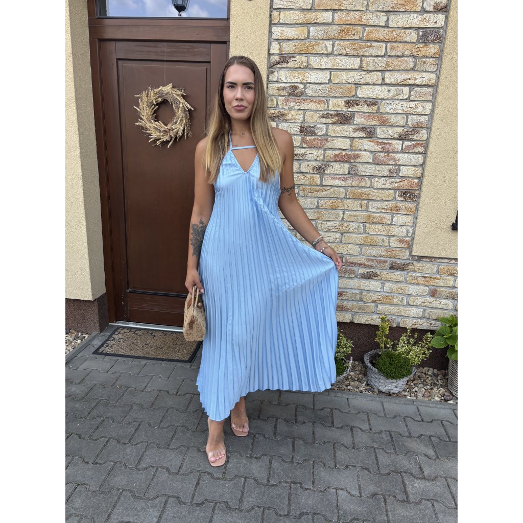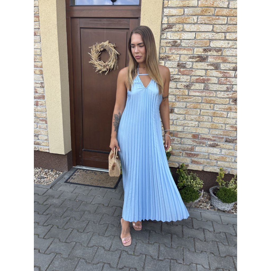 Vstupte do léta s lehkostí v těchto vzdušných plisovaných šatech „Luna Sky“. Jemný pastelově modrý odstín připomíná klidné nebe při úplňku, zatímco rafinovaný halter střih a padavý plisovaný materiál dodávají šatům ženskost a šarm. Ideální na procházku městem, letní večeři nebo dovolenou u moře.