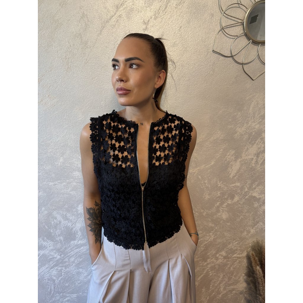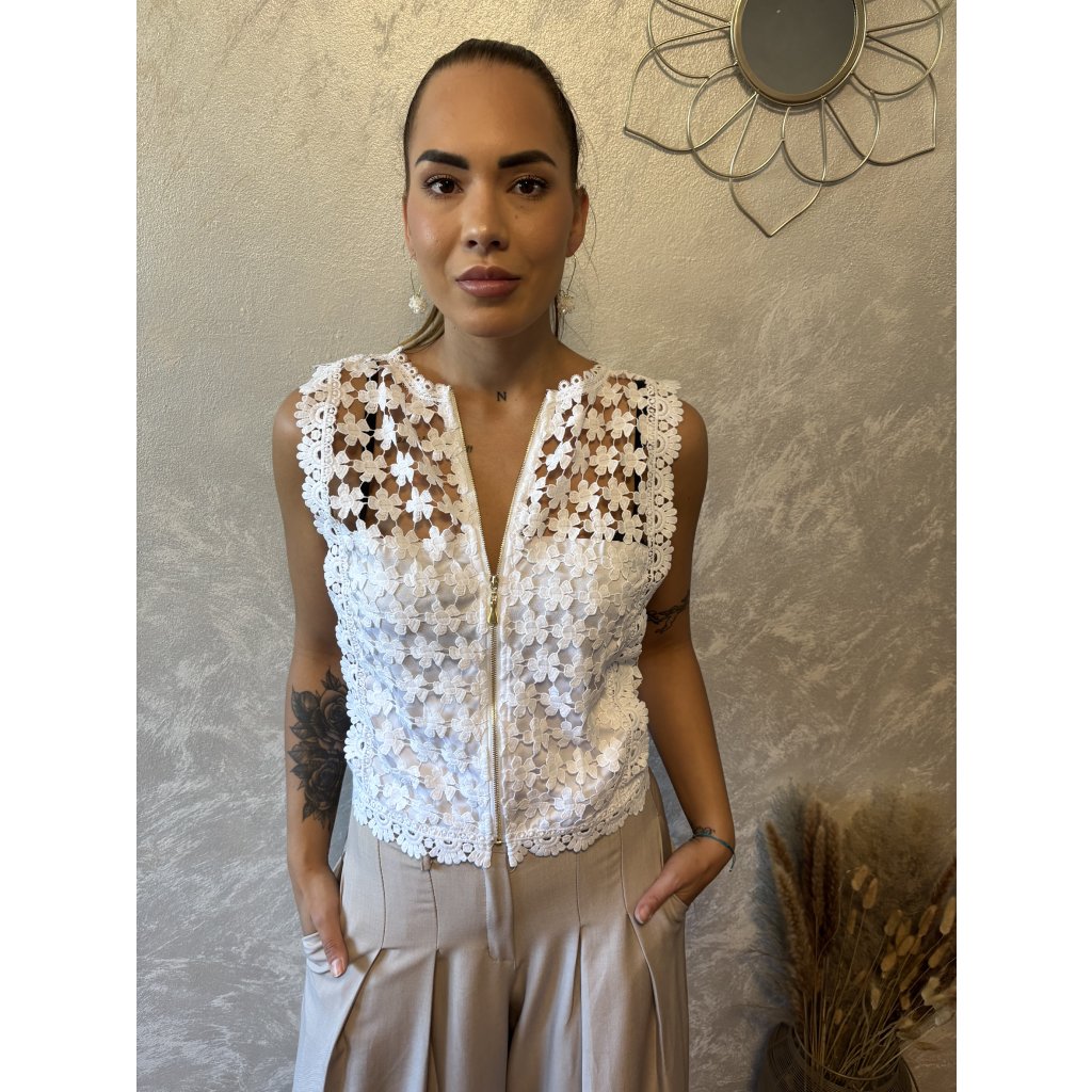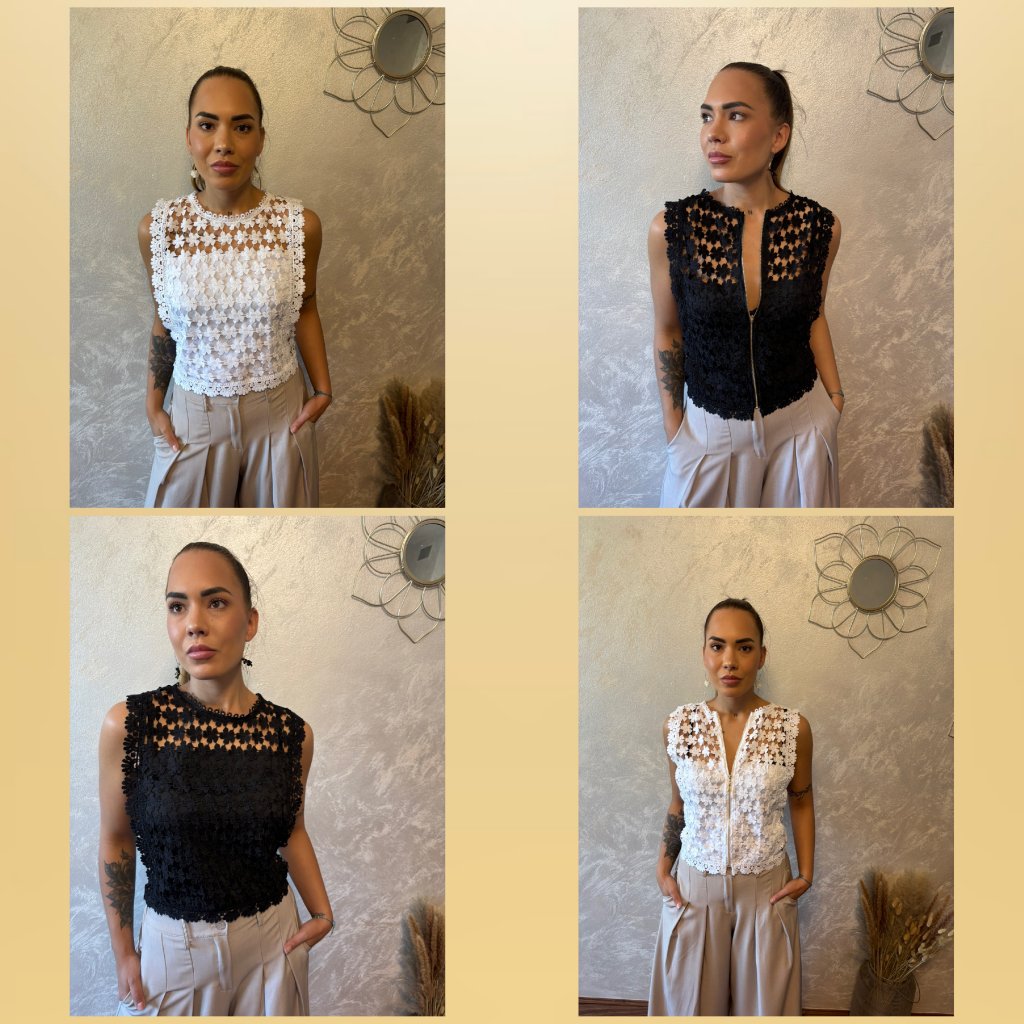 Oboustranný krajkový top „Flora“ je must-have letního šatníku. Díky promyšlenému střihu jej můžeš nosit dvěma způsoby – jako elegantní top se zapínáním vzadu nebo jako vestičku se zipem vpředu. Ideální k šortkám, džínám i sukním. Květinová krajka dodá romantický nádech. 2v1 – noste jako top nebo vestu. Dolaď svůj outfit jediným kouskem, který nabízí hned dva styly v jednom!
