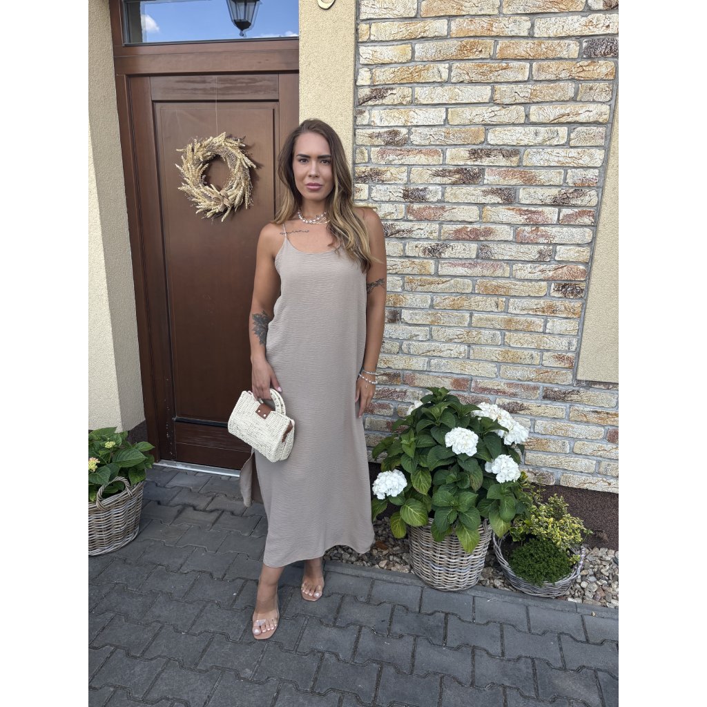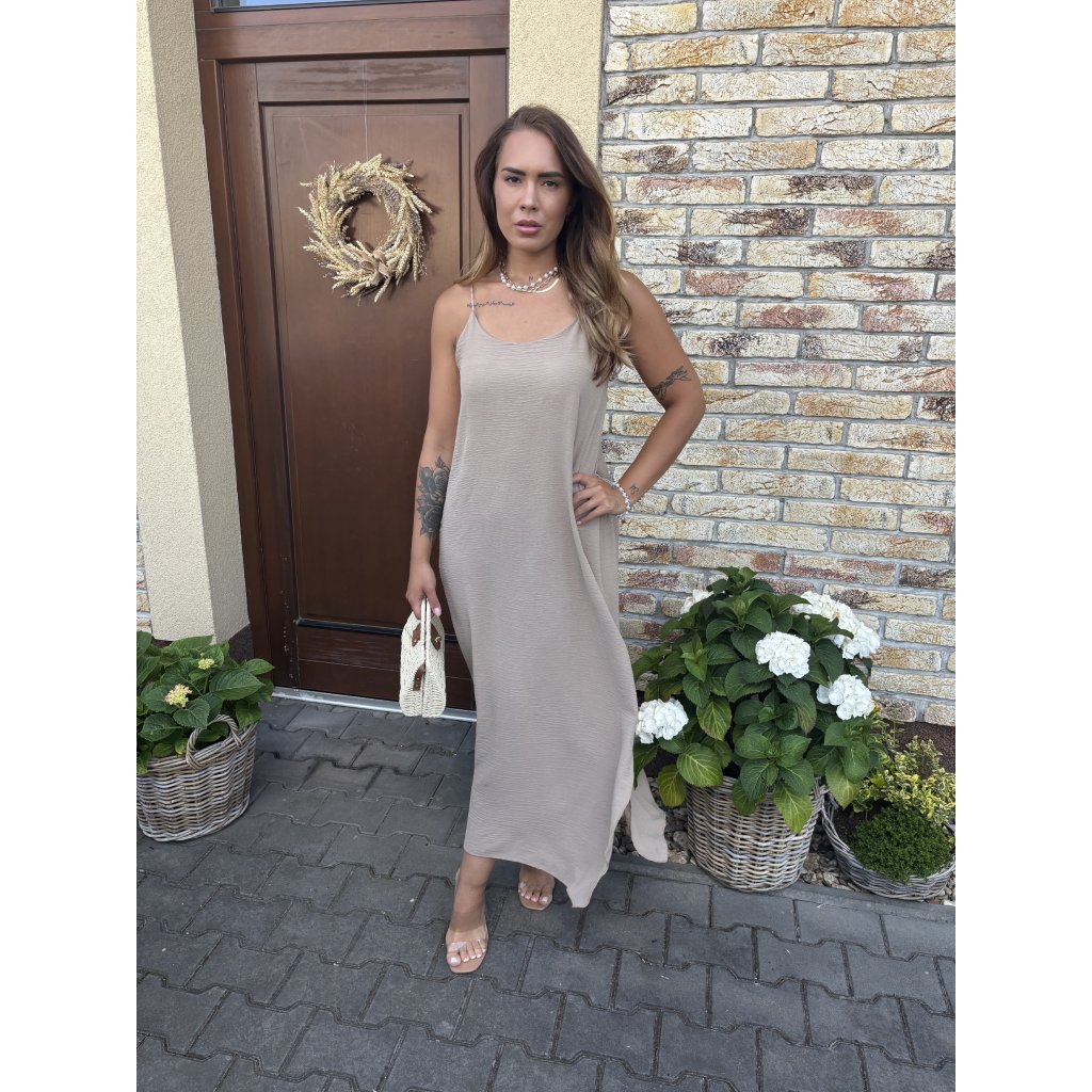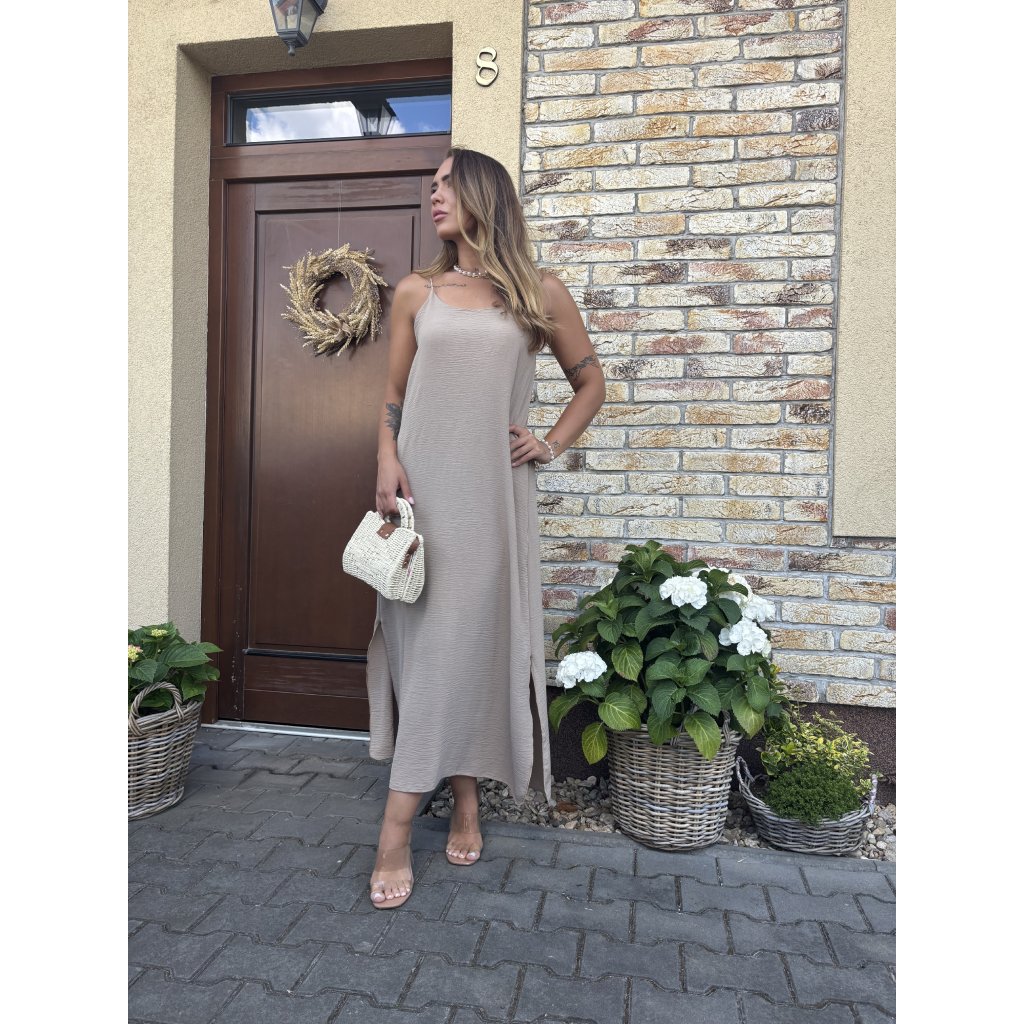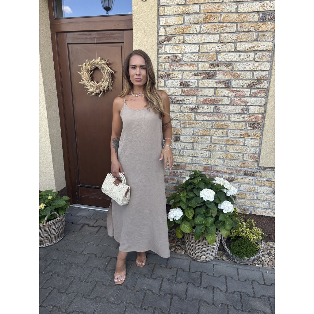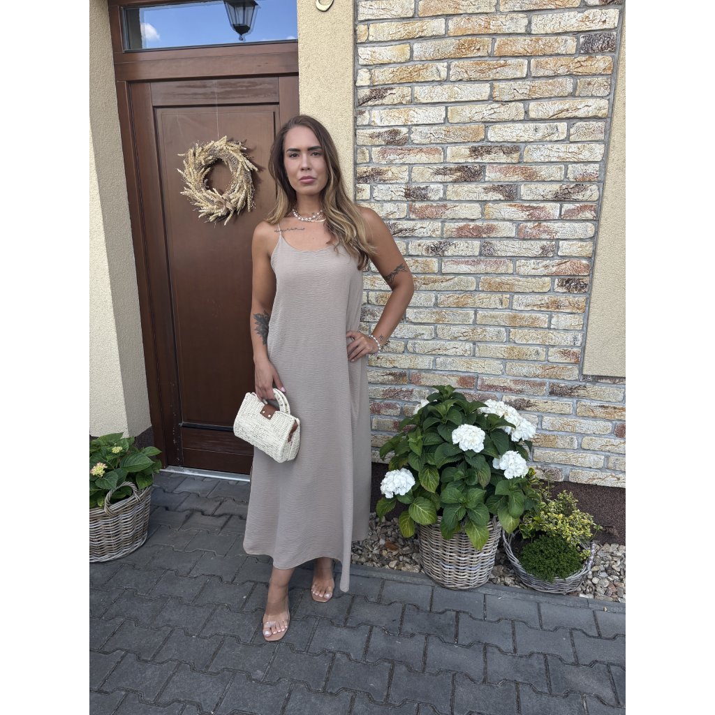 Lehké, vzdušné a neodolatelně ženské – to jsou maxi šaty Summer Whisper, které si zamilujete na první oblečení. Volný střih lichotí každé postavě a jemná struktura látky dodává outfitu elegantní šmrnc. Ramínka na zádech překřížená zajišťují maximální pohodlí i přizpůsobení, zatímco délka ke kotníkům je ideální jak do města, tak na dovolenou. Tip: Skvěle vypadá s minimalistickými sandálky a proutěnou kabelkou.