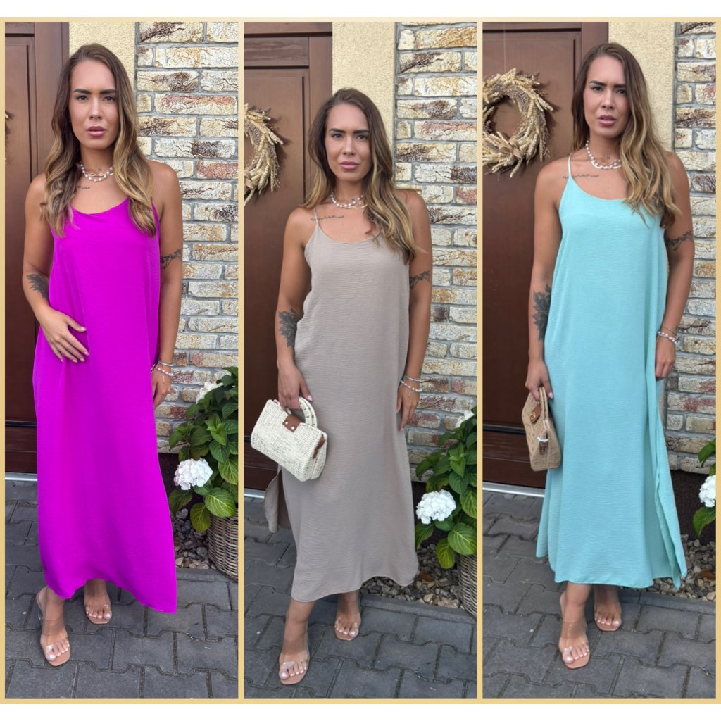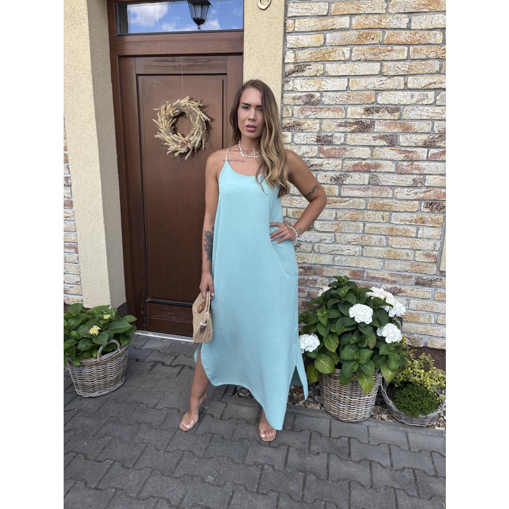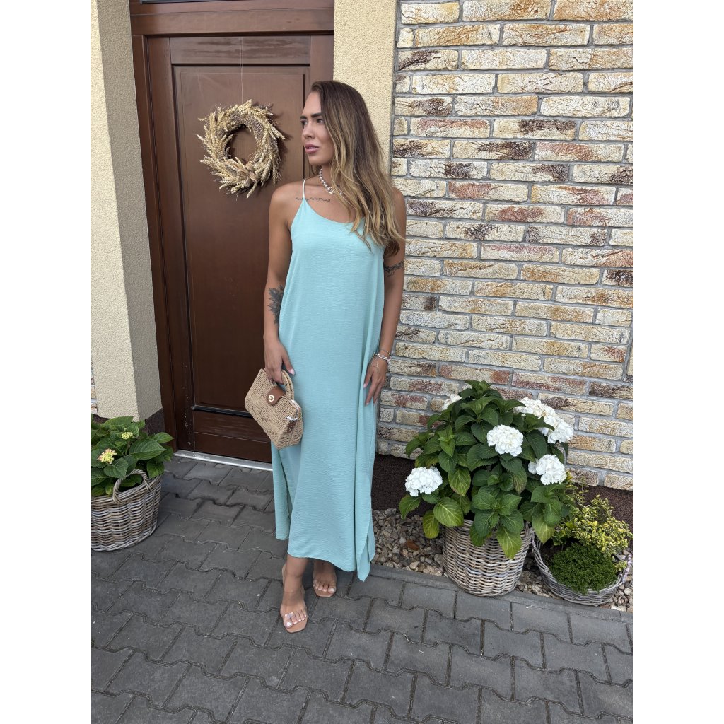Střih: Lehké a vzdušné šaty s délkou ke kotníkům, po stranách rozparky, vzadu na zádech guma