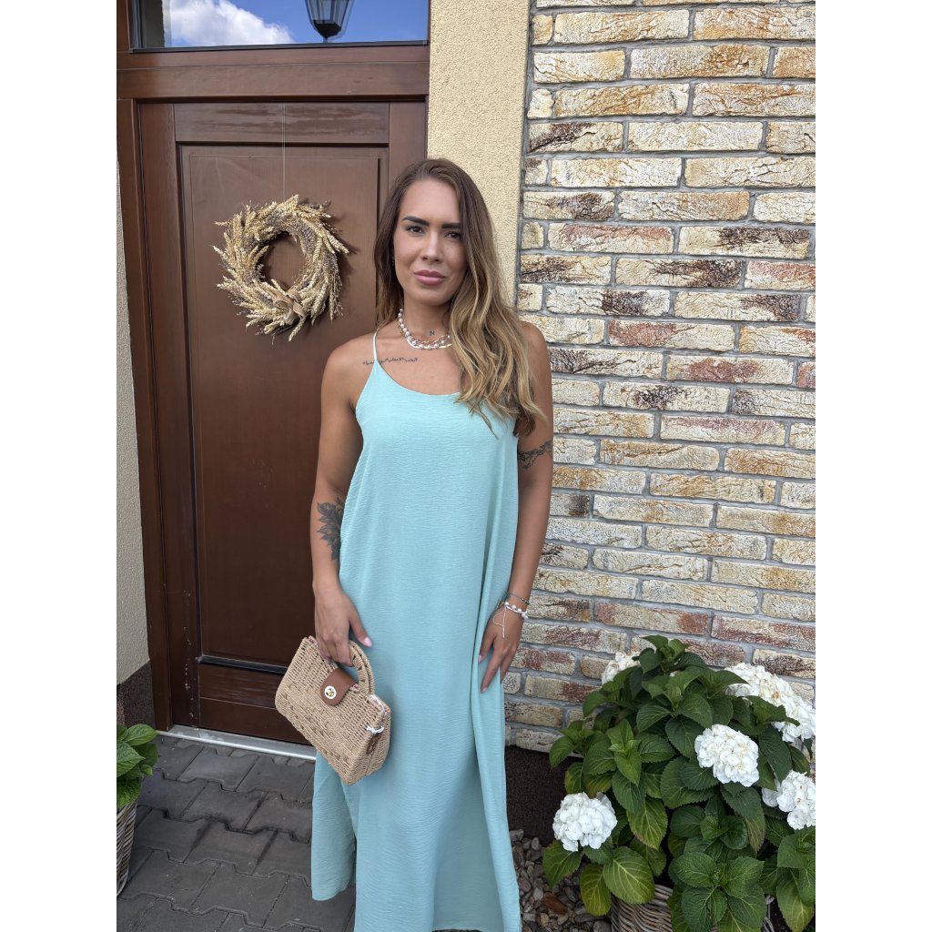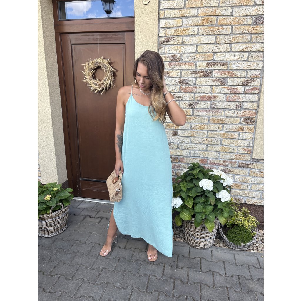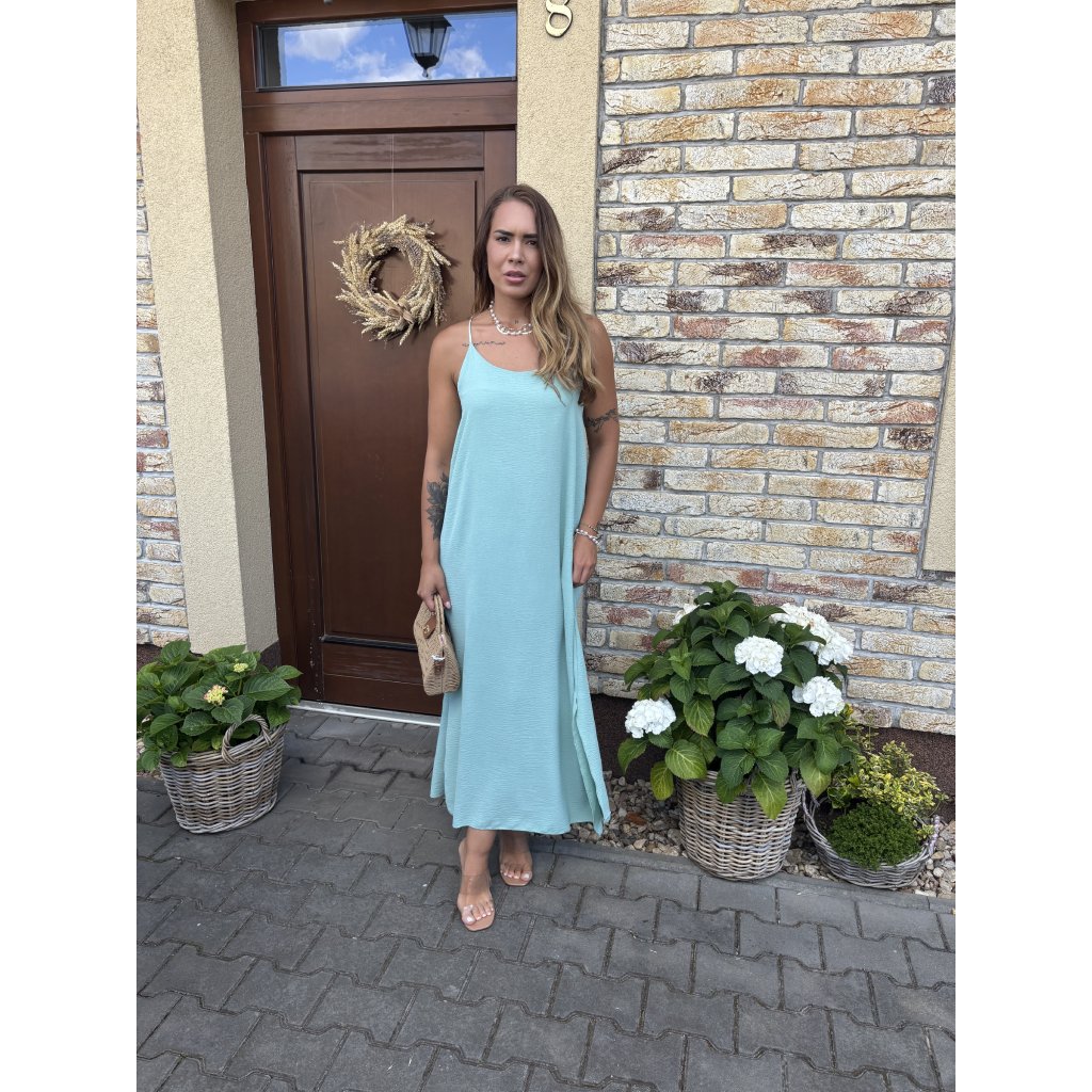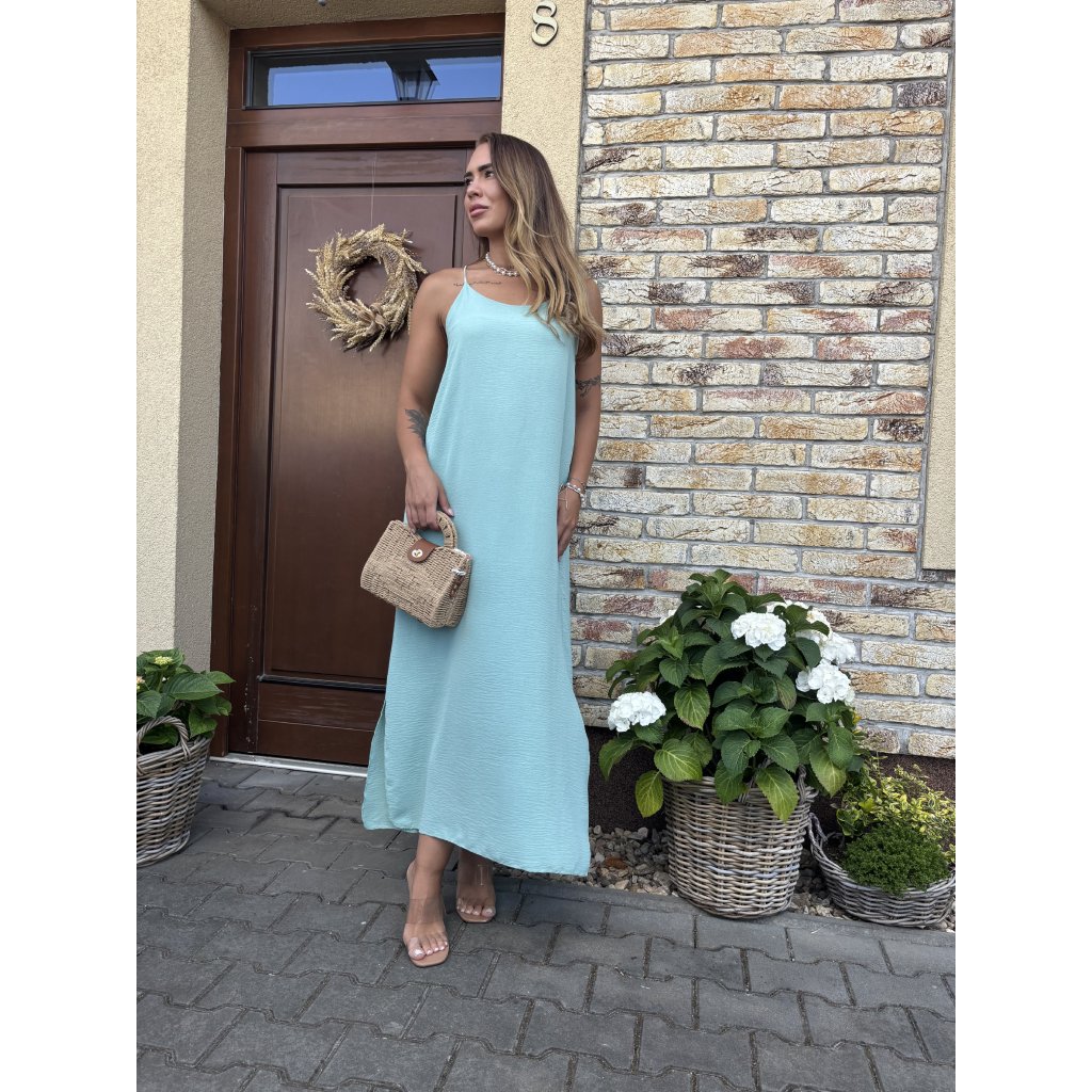 Střih: Lehké a vzdušné šaty s délkou ke kotníkům, po stranách rozparky, vzadu na zádech guma
