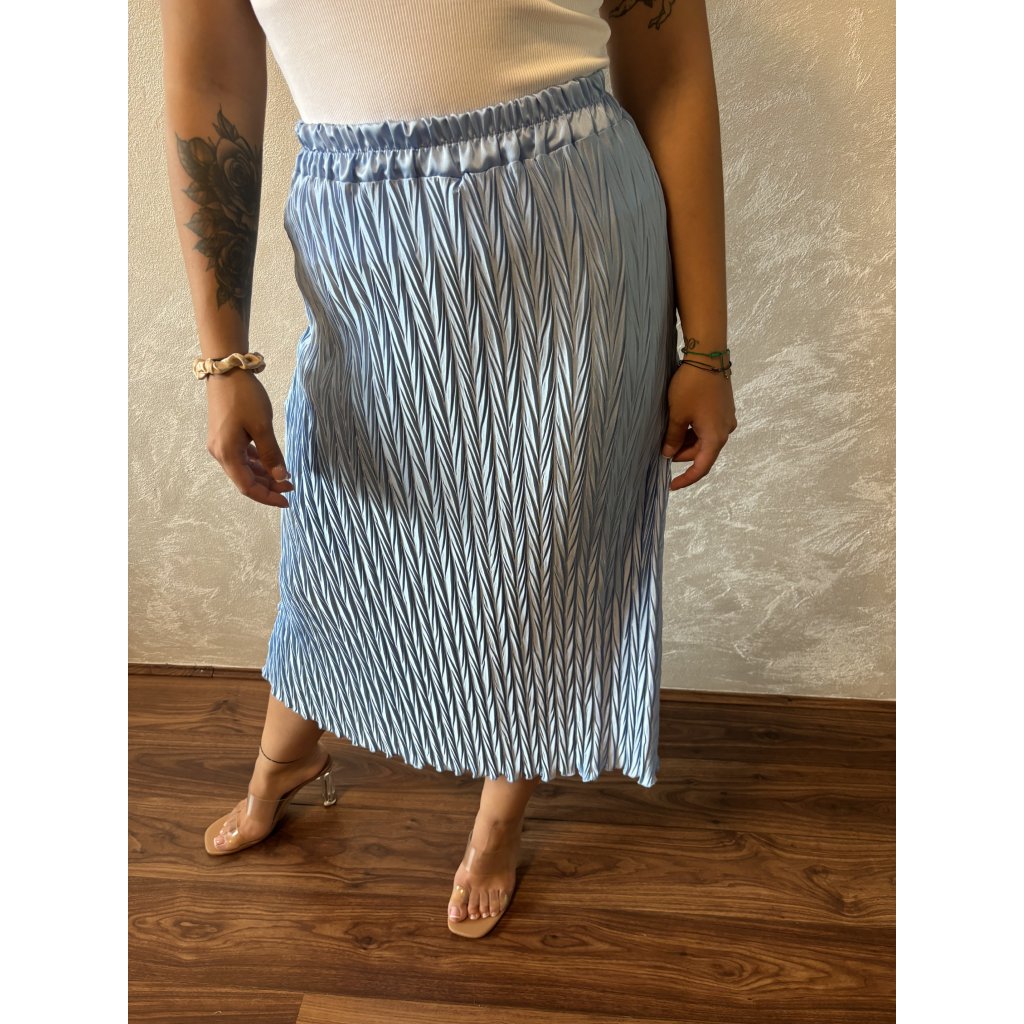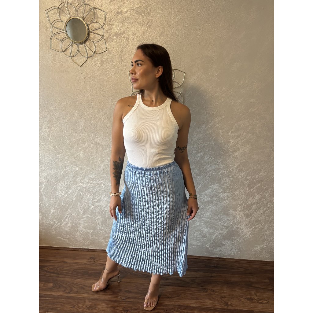 Objevte dokonalou kombinaci elegance a komfortu s touto světle modrou plisovanou midi sukní. Její jedinečná struktura s jemným geometrickým vzorem dodává outfitu zajímavý detail, zatímco lehký materiál zajišťuje pohodlí při nošení po celý den. Sukně má elastický pas, díky kterému se přizpůsobí různým typům postavy a je ideální volbou jak pro volnočasové, tak i formálnější outfity. Délka pod kolena je elegantní a stylová, zatímco plizovaný design přidává na dynamice a moderním vzhledu. Skvěle se kombinuje s jednoduchými topy či blůzkami a je ideální volbou pro každou sezónu.