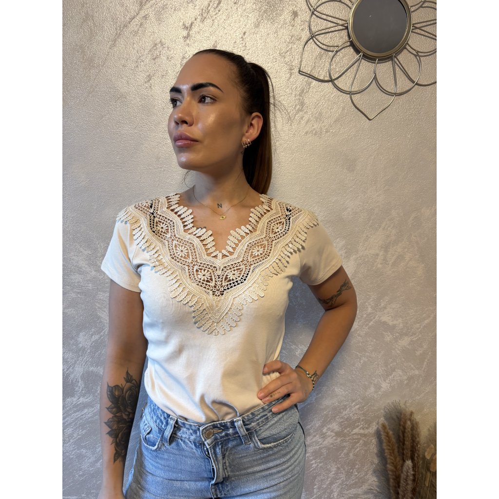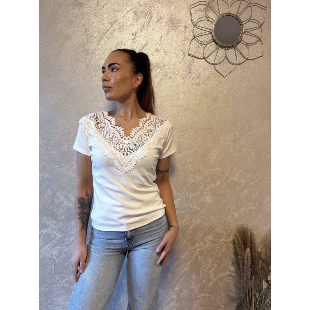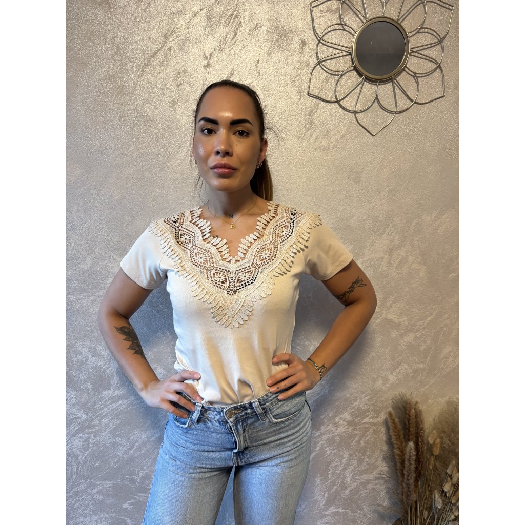 Střih: Pohodlný střih s krátkým rukávem, výrazný krajkový detail.